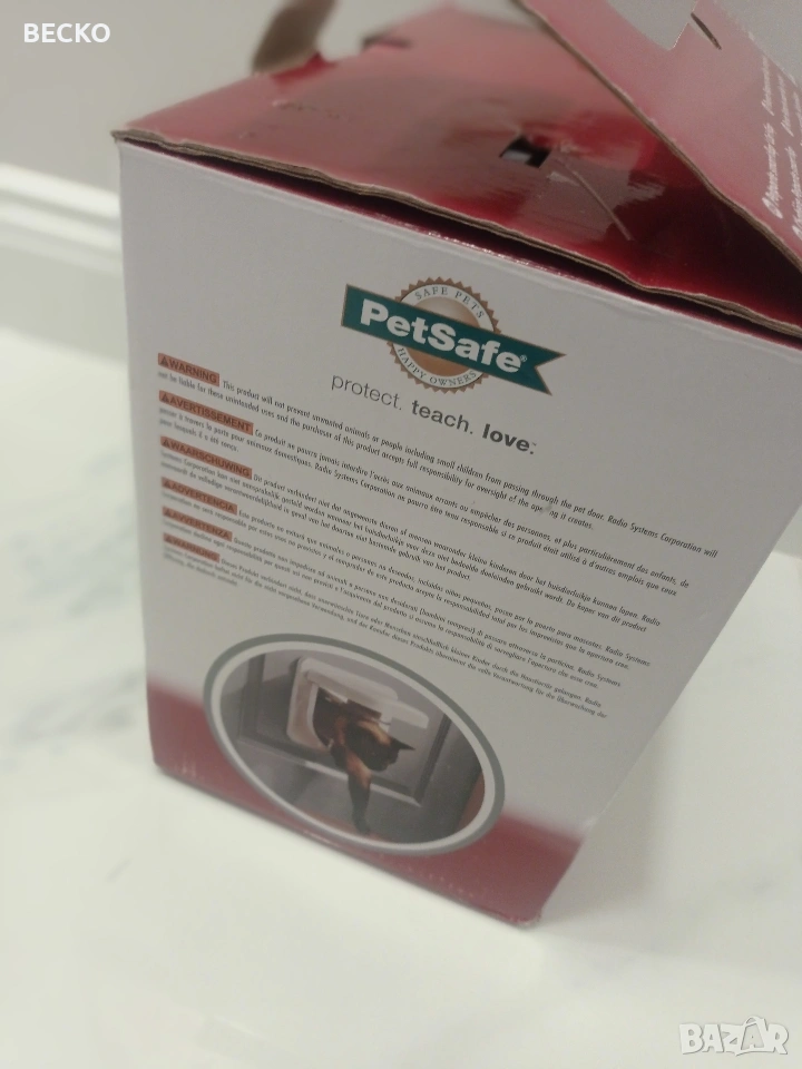 Автоматична врата за котки и малки кучета Марка: PetSafe Помага за премахване на нежелани котки Работи със стандартни 15-цифрени микрочипове на ЕС и Великобритания Включва ЕС захранващ адаптер Могат да бъдат програмирани до 25 чипа Звуков сигнал, когато вашата котка влезе Допълнителен нощен режим, за да държите котката си на закрито през нощта За котки до 7 кг Прозрачен капак Издръжлива пластмасова рамка Монтаж в стандартни тухлени стени, дървени, PVC, метални и стъклени врати Заключване с микрочип Размери на рамката: 232 mm x 232 mm x 158.6 mm Проход на клапата: 160 mm x 160 mm Размер на отвора: 180 мм х 171 мм Максимална ширина на рамото: 160 мм Размер на изреза на стъклото: 212 мм Вратата Microchip Cat Flap използва кода, присвоен на микрочипа на вашата котка. за да отключите вратата. Благодарение на този факт вече не е необходимо котката да носи допълнителни етикети, а идентификационният чип има допълнително предназначение! Капак за котки с микрочип: Petports е капак за котки, който чете микрочипа на вашата котка и осигурява достъп до дома ви за до 25 котки. Програмируем таймер: Petforte Cat Flap има вграден таймер и може да се настрои в определени часове през нощта или цифрово за заключване или отключване Работа с батерии или източници на захранване: Petforte Catflap предлага висока степен на гъвкавост и може да работи или с батерии, или със захранващ кабел Размери: 23,2см х 23,2см. Монтаж: Тази клапа за котки Petsafe Petforte може лесно да се монтира в стандартни дървени врати, PVC врати, метални врати, стъклени врати и тухлени стени Размери на рамката: 232 mm x 232 mm x 150 mm Проход на клапата: 160 mm x 160 mm Максимална ширина на раменете на котката: 160 мм Размер на отвора: 180 мм х 171 мм Размер на изреза на стъклото: 212 мм Клапата предпазва нежеланите котки Работи с 15-цифрени микрочипове на ЕС и Великобритания Включена храна Можете да програмирате до 25 токена за котки Звуков сигнал, когато вашата котка влезе в къщата Допълнителен нощен режим, за да държите котката в къщата през нощта Предназначен за котки и малки кучета до 7 кг