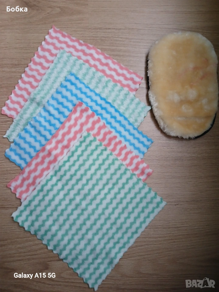 Комплект от микрофибърни кърпи в различни цветове - розово, синьо и зелено. Те са меки и абсорбиращи, идеални за почистване на повърхности или за сушене на ръце. Комплектът включва и една мека кърпа от естествена овча вълна за почистване на табло на кола. Цена за всичко 5€