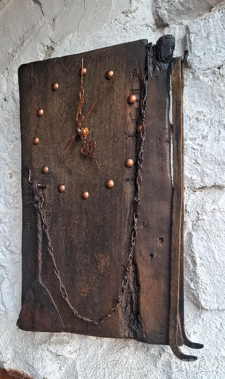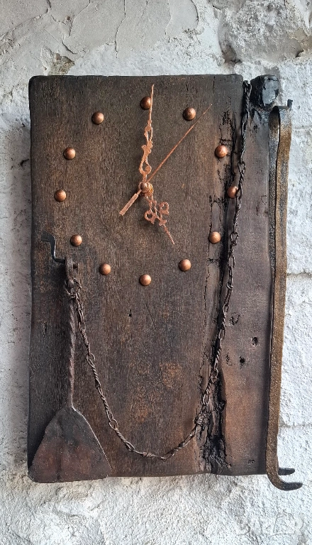 Този стенен часовник съчетава рустикална сила и тиха поезия — медни стрелки, груба текстура и огнищни инструменти, които носят спомена за живия огън.Огрибката и машата не са украса, а символ — на дом, в който огънят никога не е бил само пламък.