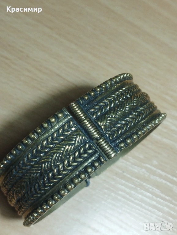 Продавам уникална старинна гривна, тип маншет, изработена с богата орнаменталика. Бижуто е в ретро стил, вероятно от месинг или бронз (жълт метал), с подчертан етно характер.