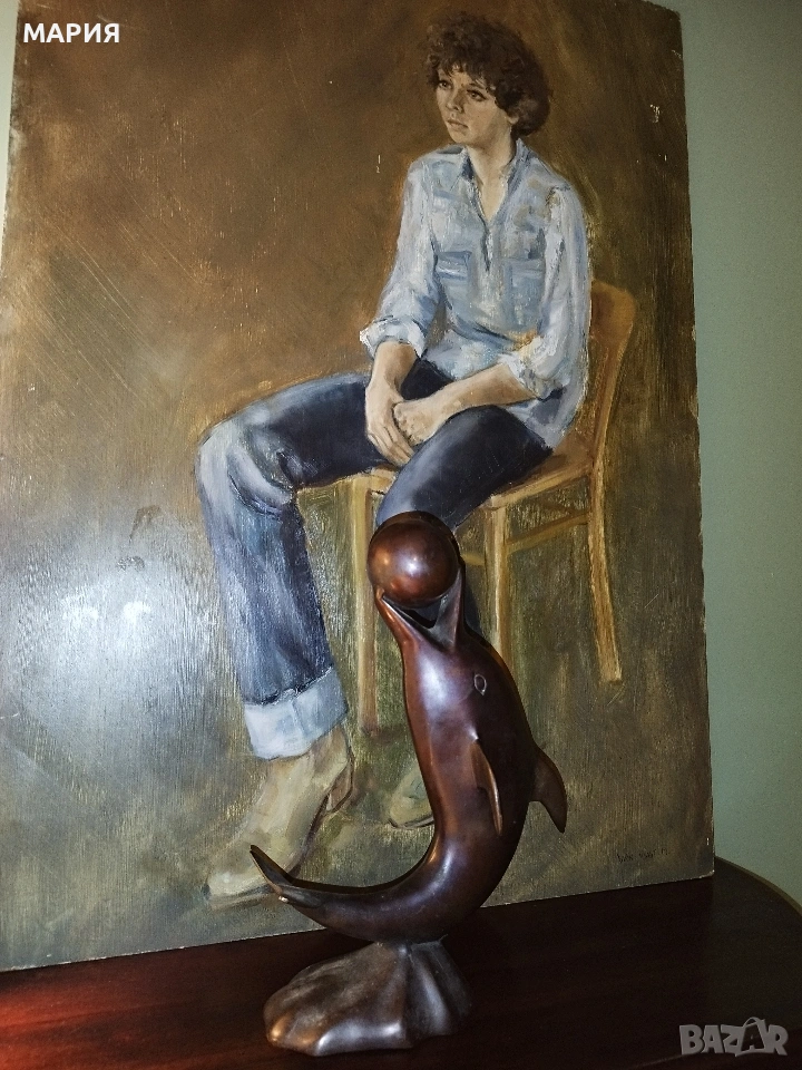 Предлагам впечатляваща винтидж декоративна скулптура – делфин с топка, изпълнена в модерен стилизиран дизайн, характерен за mid-century modern периода (1950–1970 г.). Фигурата е изработена от метал с красива естествена патина (вероятно бронз или бронзов шпиатер), с плавни линии и отлична динамика. Делфинът е представен в движение, балансиращ топка – мотив, символизиращ хармония, интелигентност и енергия. Височина: 28 см Материал: метал с оригинална патина Период: около 1950–70 г. Стил: mid-century modern / модернистичен Състояние: много добро за възрастта, с леки следи от време, които подчертават автентичния винтидж характер Скулптурата е стабилна, масивна и ефектна, подходяща както за колекционери, така и за акцент в модерен или винтидж интериор – хол, кабинет, галерия, дизайнерско пространство. Рядко срещан модел в този размер и състояние. Цена 120евро (235лв)