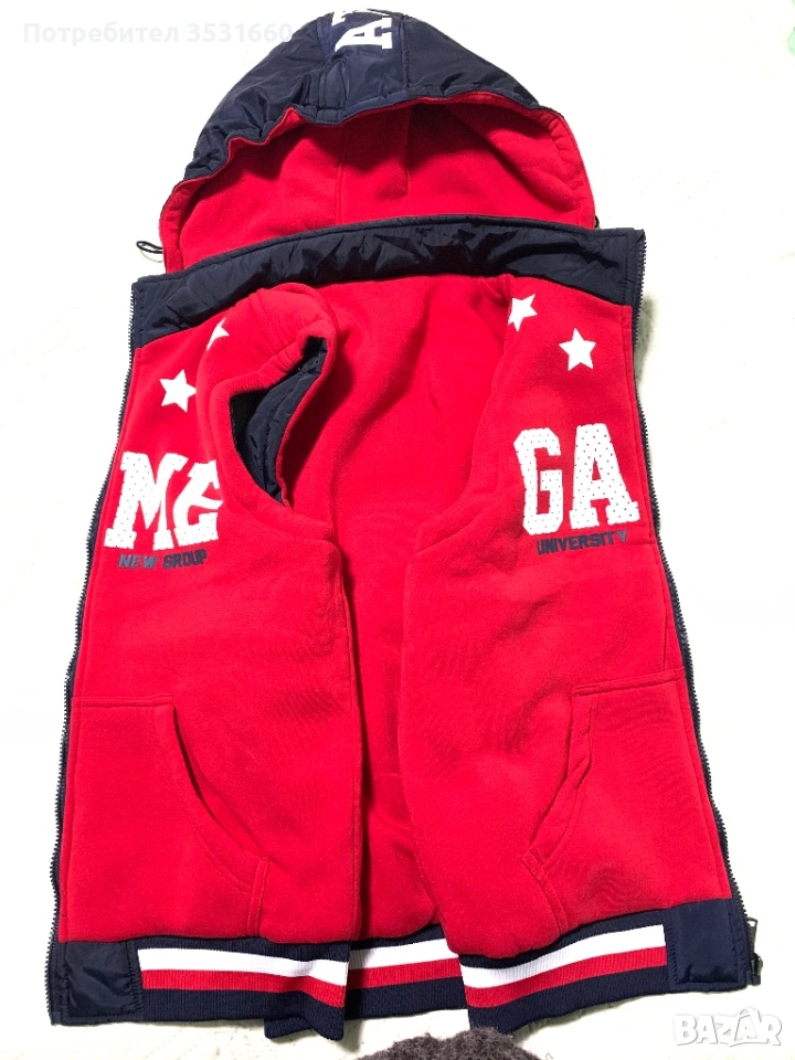 Елек ( унисекс) марка- “Ralph Lauren”- 100% оригинал, двулицев, размер М. Сваляща се качулка. Обличан е два пъти. В отлично състояние. Допълнителни размери: