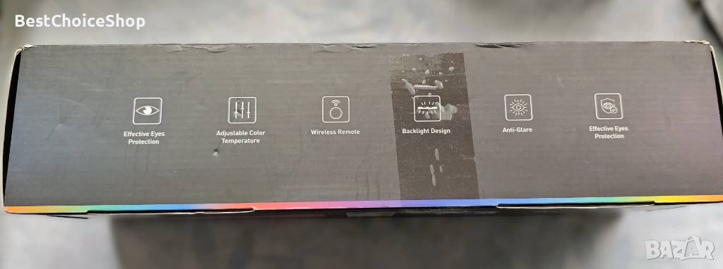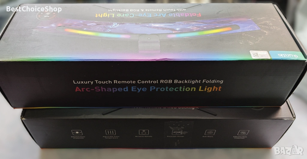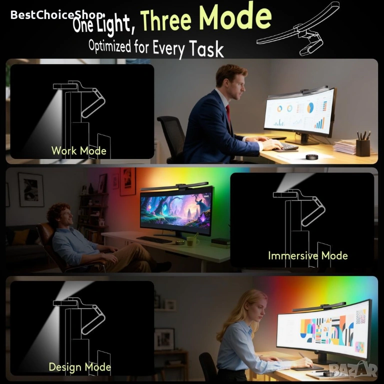LED лампа за монитор с двустранно осветяване – основна светлина към бюрото и RGB подсветка към стената за по-приятна атмосфера.