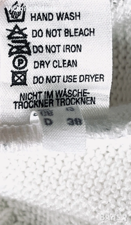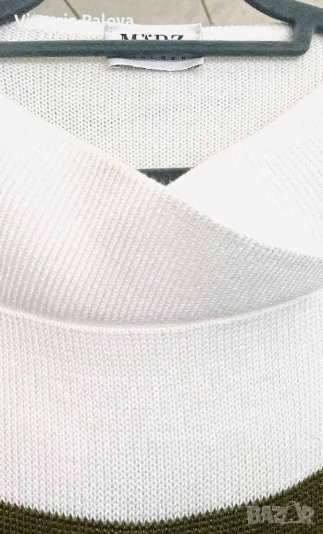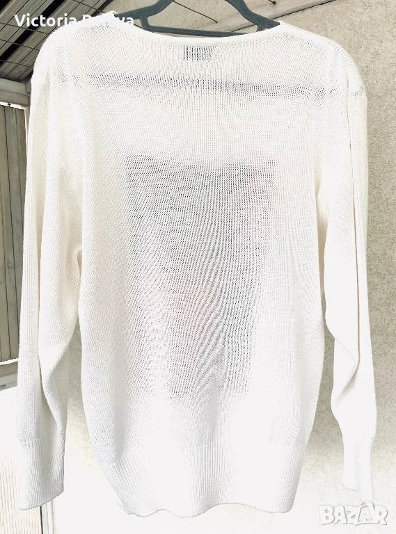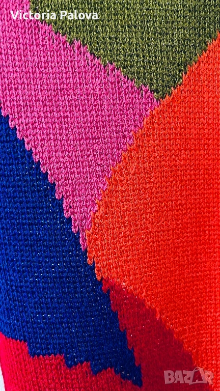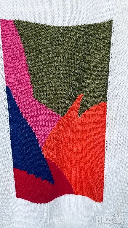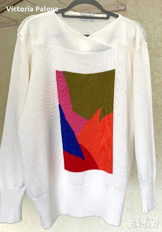 Ексклузивен плетен пуловер - утвърдена немска марка със силна репутация в луксозния трикотаж и висша конфекция. Моделът впечатлява с артистичен цветен панел в наситени тонове, който придава дизайнерски и модерен характер, както и особено елегантно V-деколте с интересна кройка тип прехлупване. Материята е луксозен микс, с красива равна плетка и отлично качество на изработката. Пуловерът е комфортен, свободен и много стилен - рядък statement piece за хора, които обичат различни и скъпи дрехи. Рамо - 50см, ГО - 59см, дължина - 69см, ръкав - 60см.