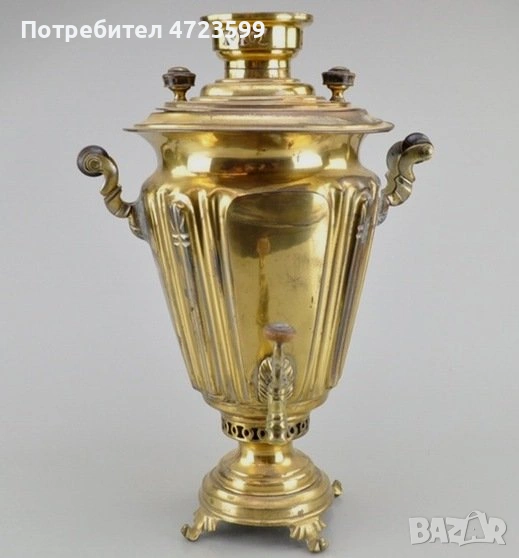 Старинен руски самовар от месинг в отлично състояние. Има характерна форма и украса. Подходящ за декорация на дом или колекция от антики.