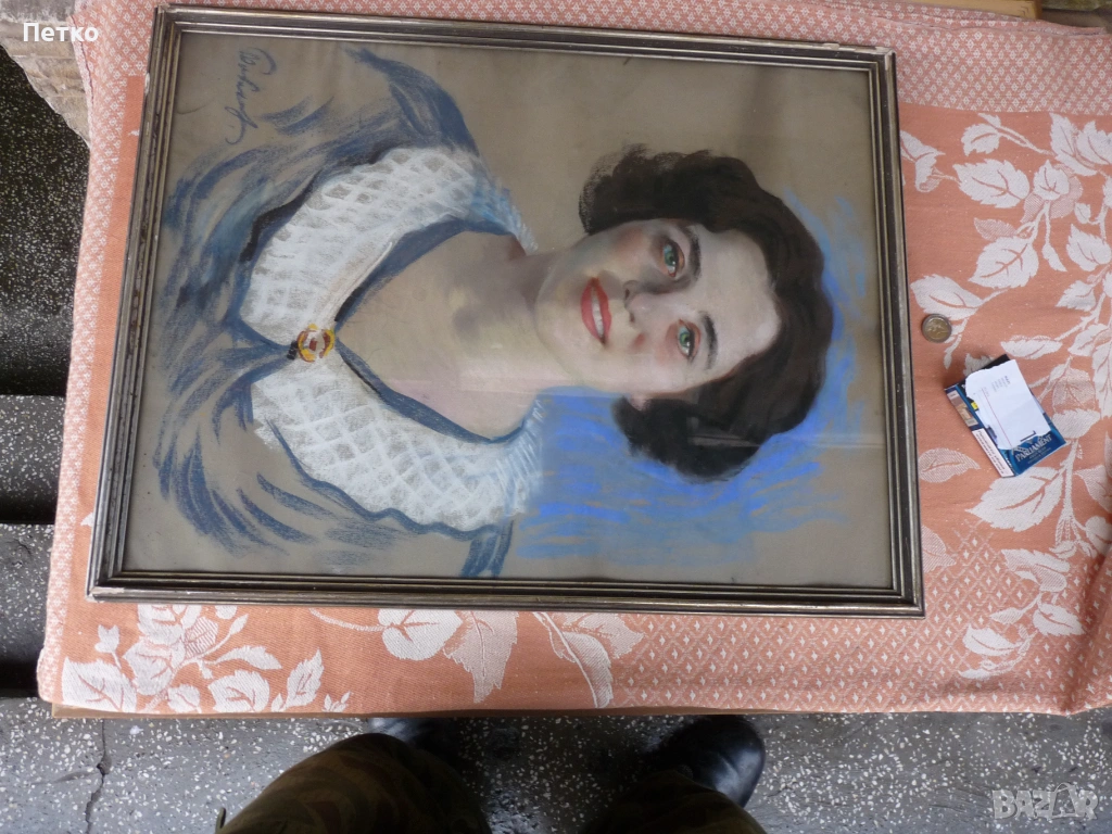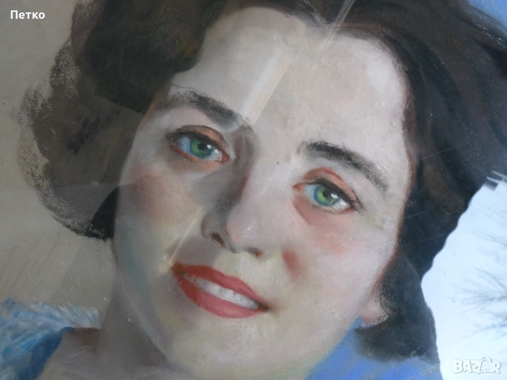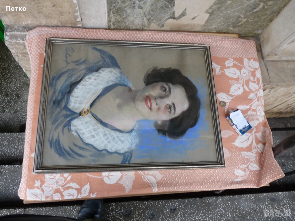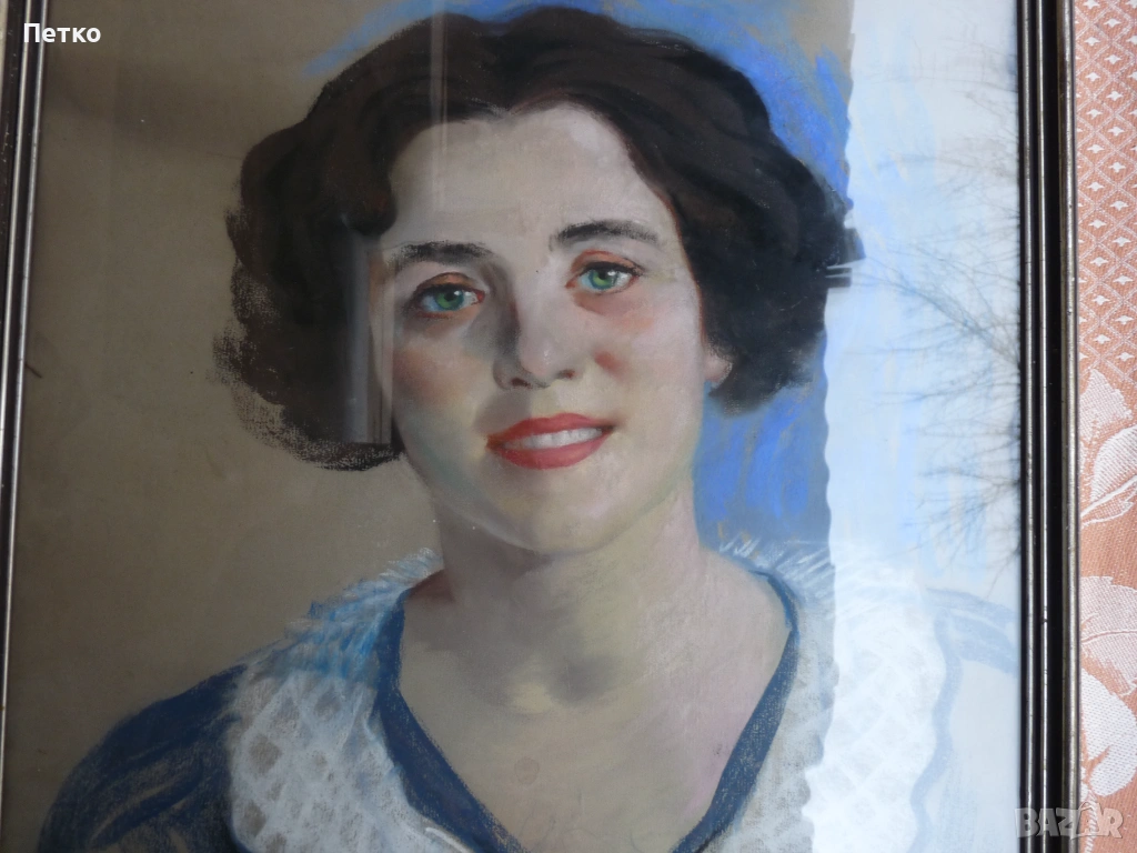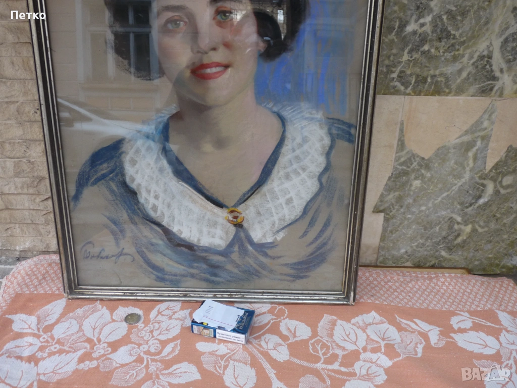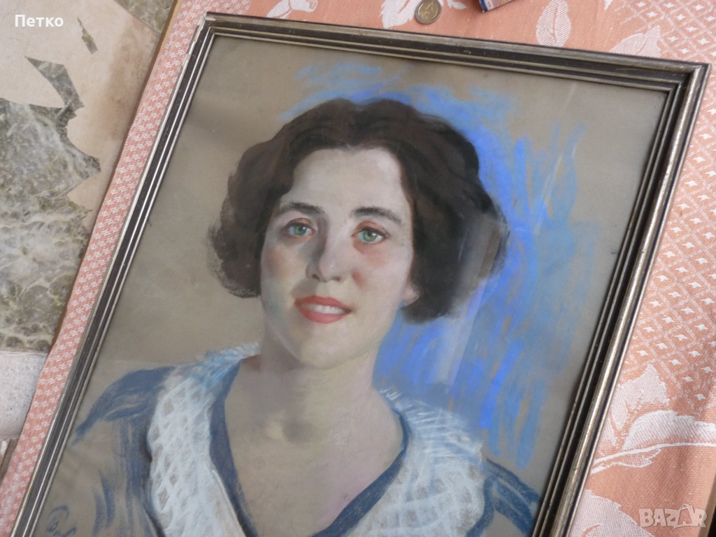 Стара картина 65 / 50 см,това е лекарката като младо момиче,на която и подарява картината художника Петър Бояджиев 1944 г Калиакра,публикувал съм и други редки картини,много добро състояние,има отблясък от стъклото.