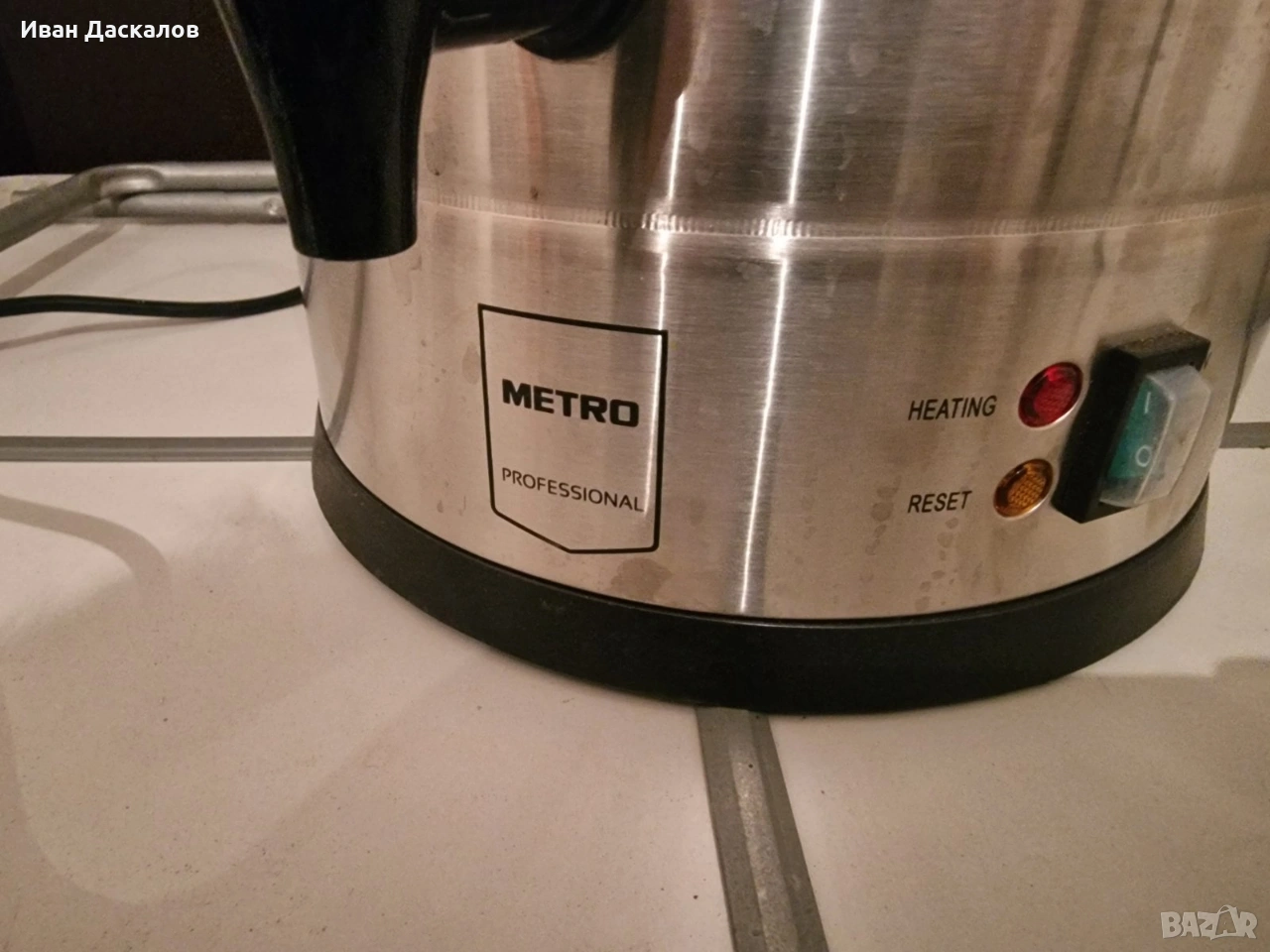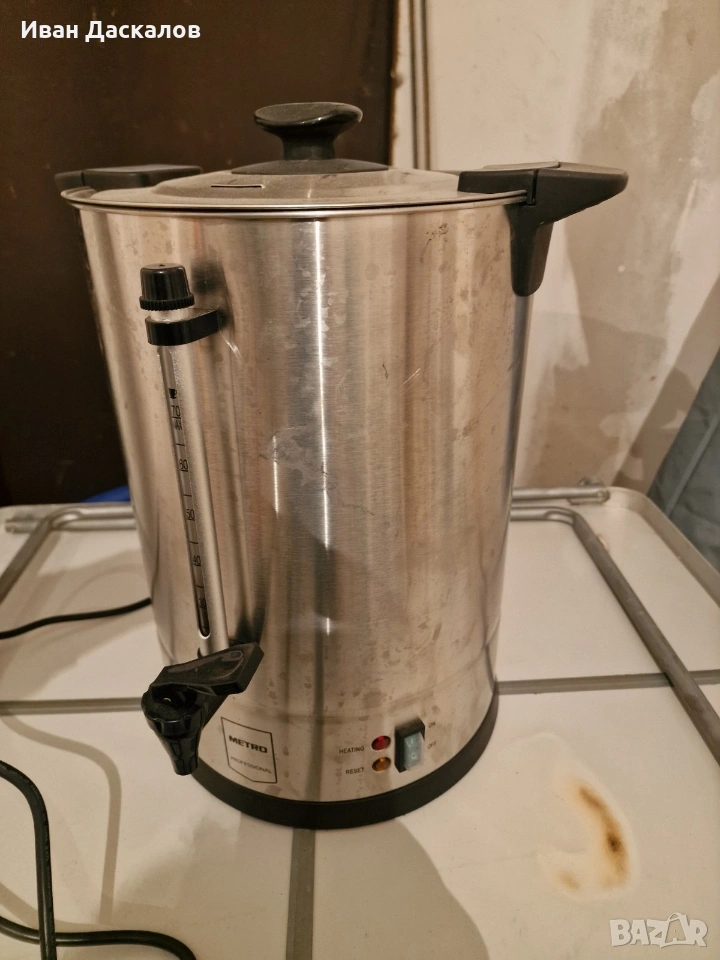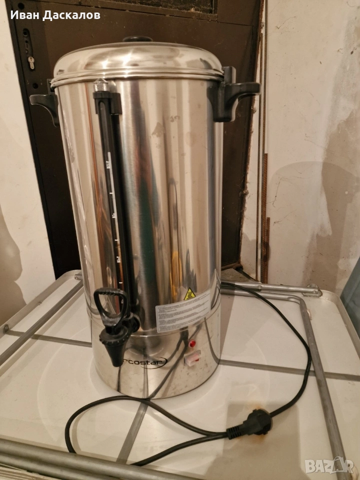 Продавам електрически диспенсър, подходящ за топла вода, чай, кафе, греяно вино и други напитки. Изработен от неръждаема стомана, с удобен кран за наливане и скала за нивото на течността.