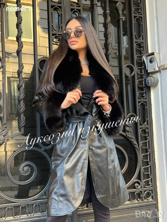 агнешка кожа и яка лисица. комбинация черно с черна яка . втален модел. закопчава се с копчета и се вталява с колан