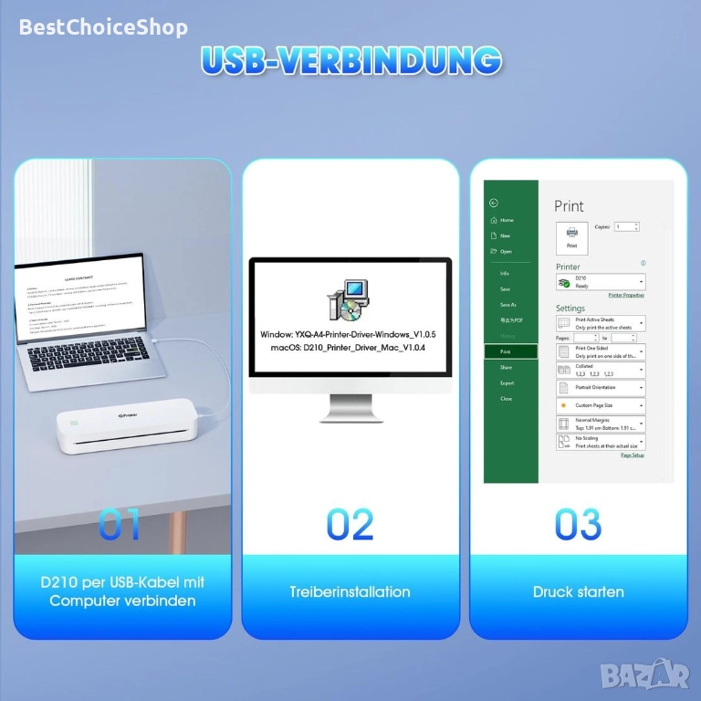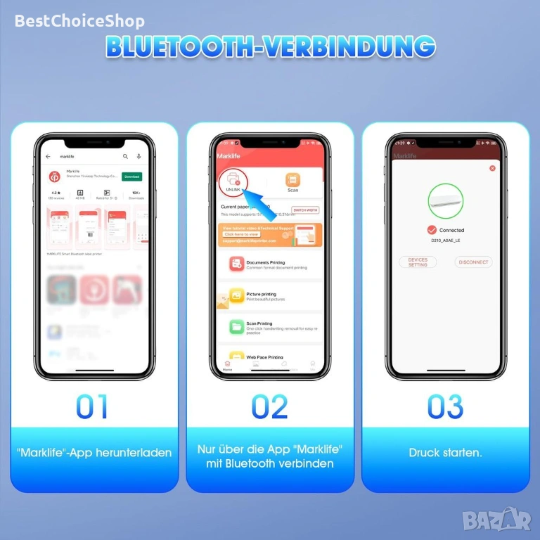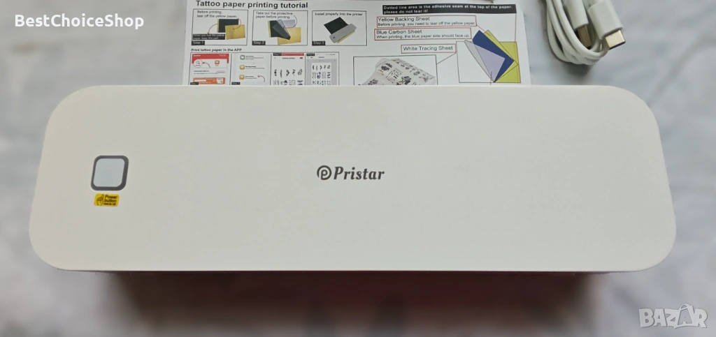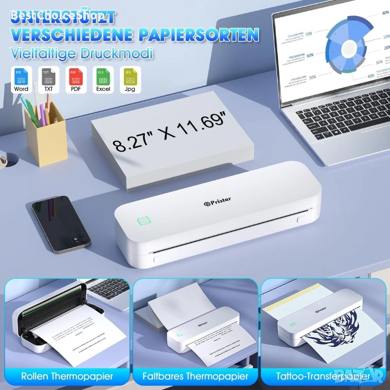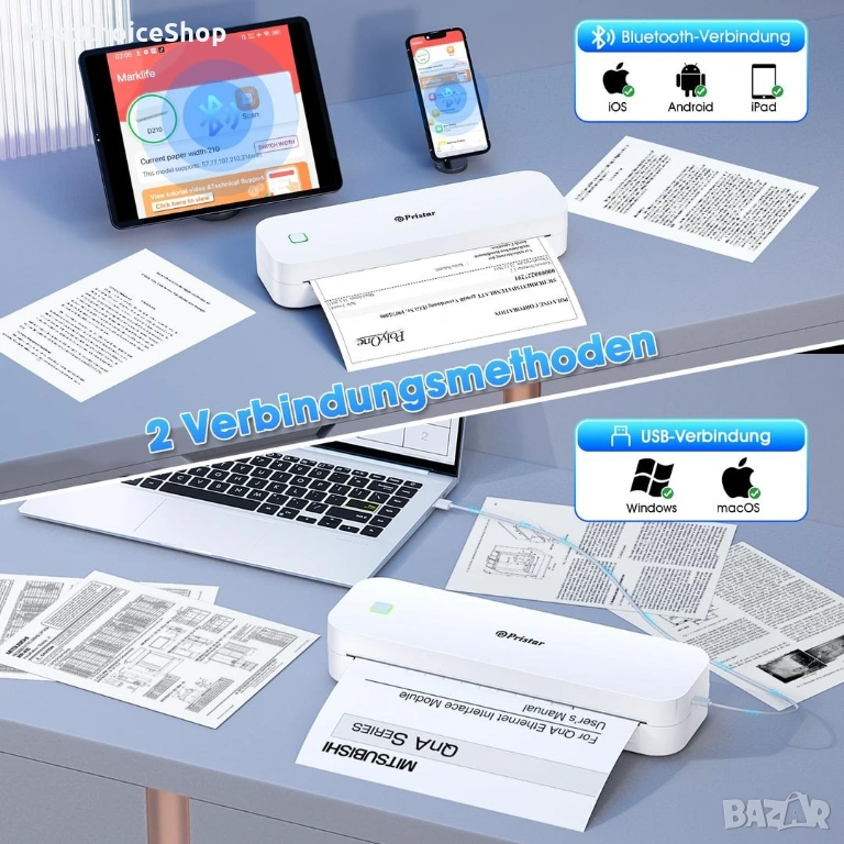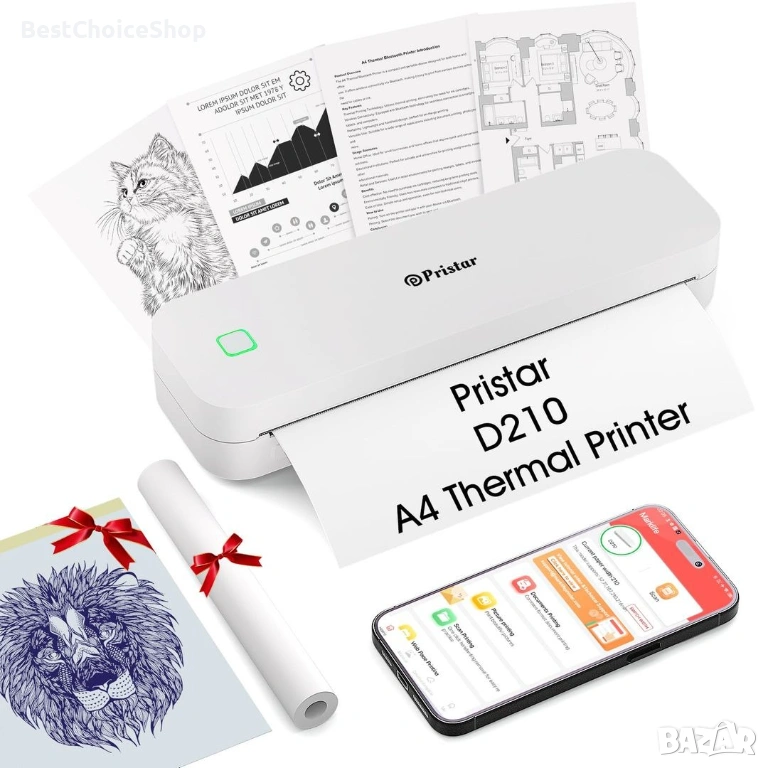 Свързва се чрез Bluetooth към телефон или таблет (Android и iOS). Подходящ за печат на документи, товарителници, договори и черно-бели файлове.