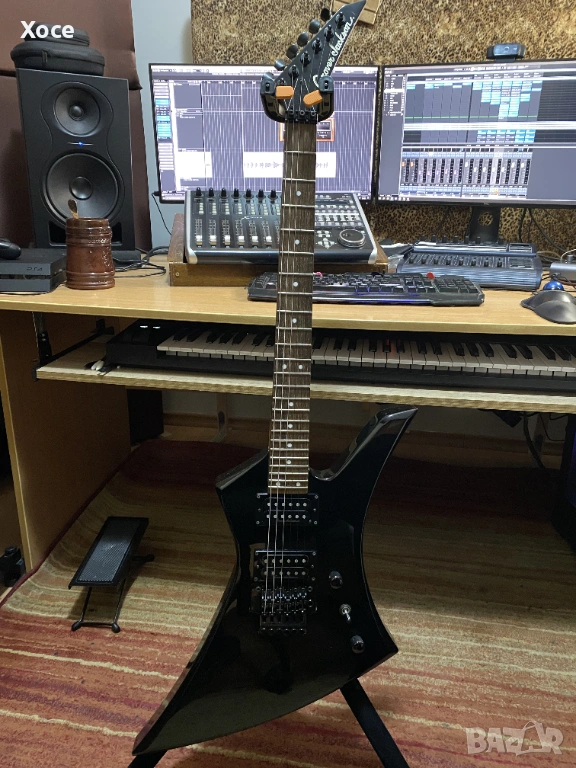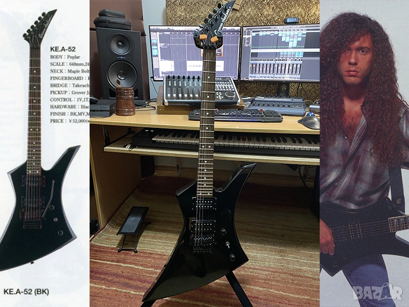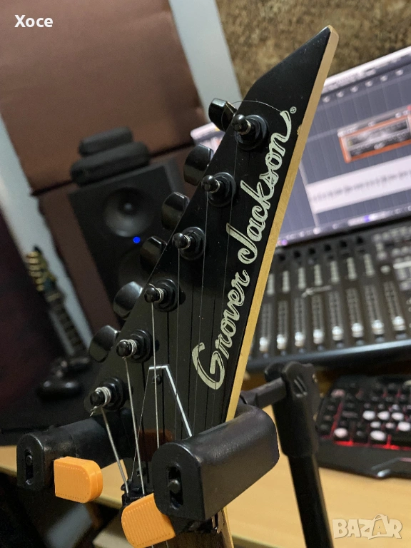 Този конкретен модел е Grover Jackson, произведен в Япония през 1997 г. Смятам, че е KE.A-52. Цялата електроника работи безупречно, а тръс прътът все още има резерв за регулиране. Липсва тремоло лостът.