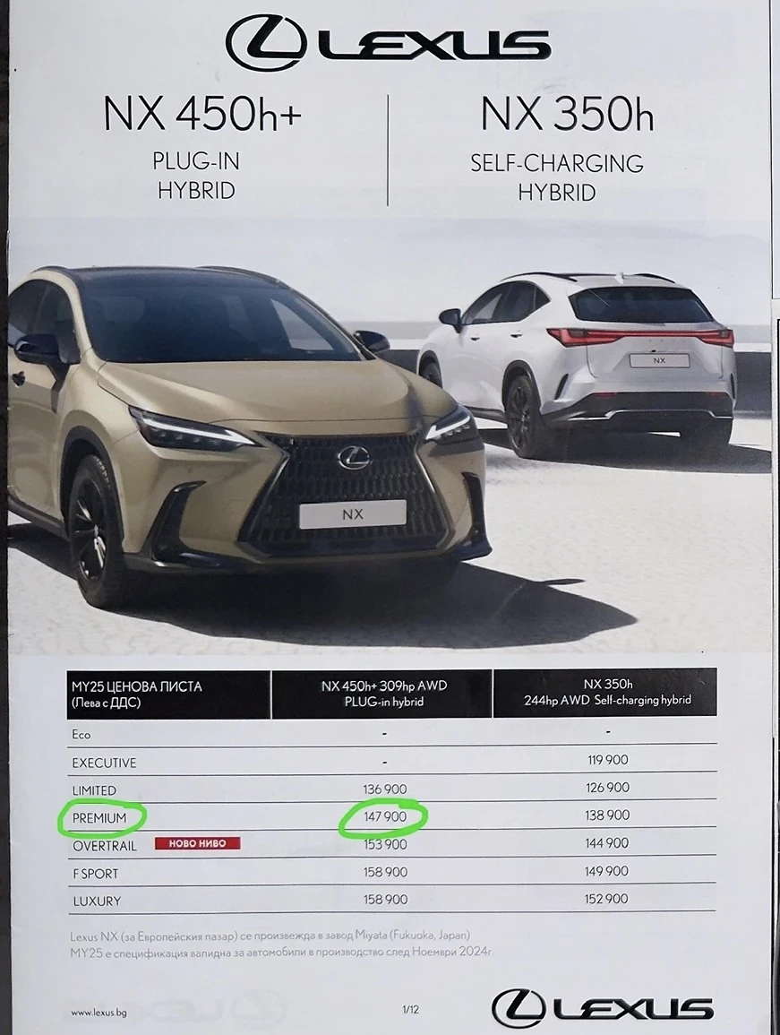 РЕАЛНА ОБЯВА ! Наличен автомобил ! Предлагаме проверен автомобил, готов за оглед, тест и покупка. Не работим с фиктивни обяви. +359 888 188 999 * Фабрично нов ( 0 км ) * Придобивате първа собственост и ставате първи собственик. * 10 години пълна Гаранция на автомобила * 10 години пълна Гаранция на батерията Ниво на оборудване * PREMIUM * LEXUS NX 450H+ Plug in Hybrid 309 кс * ПРОИЗВЕДЕН ЗА ЕВРОПЕЙСКИЯ ПАЗАР - Валидна международна гаранция към всяко едно представителство в цяла Европа. ( 4 x 4 ) AWD - All Wheel Drive - Интелигентна 4Х4 система от последно поколение. * Фабрична цена по шоурумите в Европа ~ 150 000 лв. - МОДЕЛ 2025 ( MADE IN JAPAN ) - Екземпляра е произведен в завода - Miyata ( Fukuoka, Japan) High End - Най-висококачественият Hybrid - Карате 100 км само на ток след което се движите на смесен цикъл ( Ток + Бензин ) при което батерията се самозарежда и никога не ви свършва за разлика от другите марки автомобили. БЕЗОПАСНОСТ И АСИСТИРАЩИ СИСТЕМИ: 1. Dynamic Radar Cruise Control (Distronic Plus) 2. Lane Trace Assist 3. Lane Departure Alert 4. Pre-Collision System 5. Road Sign Assist 6. Emergency Steering Assist 7. Blind Spot Monitor (BSM) 8. Интелигентни парктроници с автоматична спирачка ICS 9. Hill Assist Control 10. Trailer Sway Control 11. EPB електронна и автоматична ръчна спирачка 12. AUTO HOLD задържа спирачката вместо вас 13. Автоматично включване и изключване на дългите светлини 14. Огледала с предупреждение за мъртва зона, самоприбиране, автоматична бленда и подгряване КОМФОРТ И ИНТЕРИОР: 15. My Lexus Link App управление от смартфон на климатика, заключване, багажник, GPS проследяване, анализи и др 16. Подгряване на волана 17. Подгряване на предни седалки 18. Подгряване на предното стъкло 19. Подгряване на чистачките 20. Система за бързо отопление през зимата и охлаждане през лятото 21. Премиум седалки с перфорирана и дишаща кожа (Smooth Leather Black) 22. Бели декоративни шевове на седалките 23. Електрически предни седалки 24. Лумбална опора с 4-посочно регулиране 25. Двузонов климатроник 26. Климатик за задните седалки + 2 USB 27. Волан с електрическо регулиране във всички посоки 28. Автоматично прибиране на волана при слизане 29. Централна конзола и кори на вратите от шита кожа 30. Start/Stop бутон 31. Keyless Go безключово отключване и запалване 32. Ел. багажник управление от салона, дистанционното и приложението 33. Мултифункционален кожен волан 34. Пера за превключване на скоростите от волана (Steptronic) 35. Светещи интериорни прагове 36. Амбиентно интериорно осветление 37. Високо ниво на шумоизолация 38. Йонизиране и пречистване на въздуха ИНФОТЕЙМЪНТ И ДИСПЛЕИ: 39. 14-инчов тъчскрийн дисплей 40. Оригинална Lexus навигация + интернет + браузър 41. Wi-Fi свързаност 42. Apple CarPlay / Android Auto 43. Гласово управление 44. Безжично зареждане (NFC) 45. DAB цифров радио тунер 46. Аудио система с 10 високоговорителя 47. 5 USB порта 48. Digital Cockpit персонализиран дигитален километраж 49. Lexus Digital Welcome анимация при стартиране 50. Energy Flow Display визуализация на хибридната система и 4x4 51. G-Sensor показва напрежения и наклони ЕКСТЕРИОР И СВЕТЛИНИ: 52. Боя: Бяла хамелеонова перла 53. Хром пакет 54. Затъмнени задни и цветни предни стъкла (заводски) 55. Черни странични арки на калниците 56. Нощно екстериорно осветление при доближаване 57. Завиващи адаптивни фарове 58. Bi-Xenon + LED светлини 59. Автоматични фарове и чистачки 60. Огледала с осветление при приближаване СЕРТИФИКАТ ЗА СЪОТВЕТСТВИЕ МЕЖДУНАРОДНА ЕВРОПЕЙСКА ГАРАНЦИЯ Чисто нов автомобил без нито една забележка Абсолютно всички аксесоари са неразопаковани * Към автомобила получавате: * 2 ключа * Чисто н