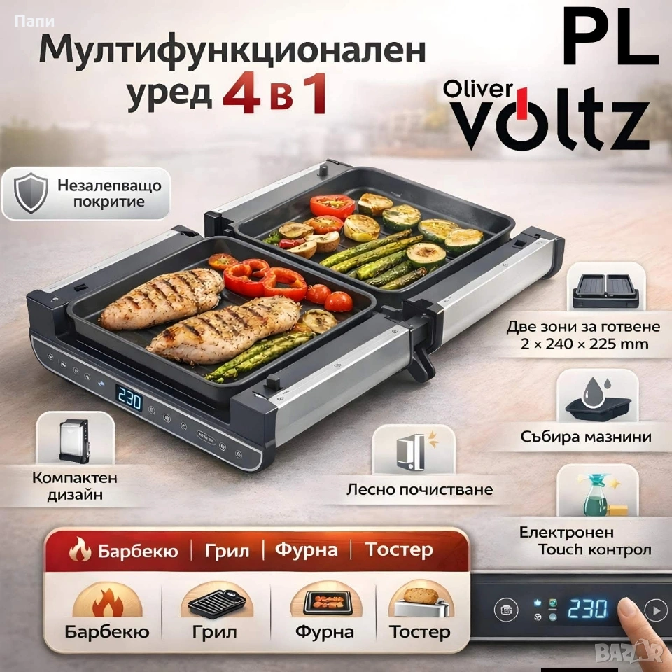 Описание: Мултифункционален уред за готвене 4 в 1 Открий удобството на мултифункционалния уред за готвене 4 в 1, който съчетава тостер, грил / парти грил, фурна и BBQ в едно компактно и мощно решение. Създаден за бързо, здравословно и вкусно готвене у дома, този уред е идеален както за ежедневни ястия, така и за семейни и приятелски събирания. Барбекюто разполага с 2 независими зони за готвене, всяка с размер 240 × 225 mm, което позволява едновременно приготвяне на различни храни. Незалепващото покритие и подвижните плочи осигуряват лесно почистване, а тавата за събиране на излишната мазнина подпомага по-здравословното готвене. Уредът е изработен от висококачествен PA6 материал, устойчив на високи температури, и разполага със защита от прегряване за максимална безопасност. Електронният контрол на температурата и времето с управление с едно докосване осигурява прецизни резултати при всяко готвене. Благодарение на компактния си дизайн и възможността за вертикално съхранение, уредът заема минимално място и е изключително удобен за всяка кухня. ОСНОВНИ ХАРАКТЕРИСТИКИ: Тип: Мултифункционален уред 4 в 1 Функции: Тостер, Грил / Парти Грил, Фурна, BBQ Размер на грил тавата: 240 × 225 mm 2 зони за готвене (по 240 × 225 mm всяка) Незалепващо покритие и подвижни плочи Тава за събиране на излишната мазнина Електронен контрол на температура и време Защита от прегряване Материал: PA6 – устойчив на високи температури Компактен дизайн с вертикално съхранение Размери на продукта: 36 × 25 × 16 см Мощност: 1400–1700W Захранване: 220–240V~, 50/60Hz Един уред. Безкрайни възможности. С този мултифункционален уред 4 в 1 готвиш бързо, лесно и здравословно – от хрупкави тостове до сочни BBQ специалитети. Компактен, мощен и интелигентен – идеалният избор за модерната кухня. Състояние:Ново 2 години гаранция Доставка до 3-4 дни с преглед и тест Цена:110€