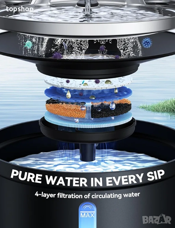 Висококачествени материали Изработен от неръждаема стомана която е по трайна лесна за почистване и предотвратява развитието на бактерии за разлика от евтините пластмасови фонтани.