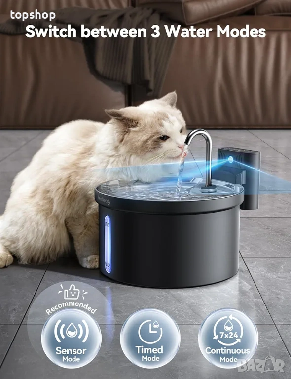 Сензор за движение и режими на работа Фонтанът има три режима. Сензорен режим засича животното в обхват от 120 градуса и пуска вода за 20 секунди. Временен режим пуска вода на всеки 15 минути. Непрекъснат режим работи когато устройството е включено в мрежата.