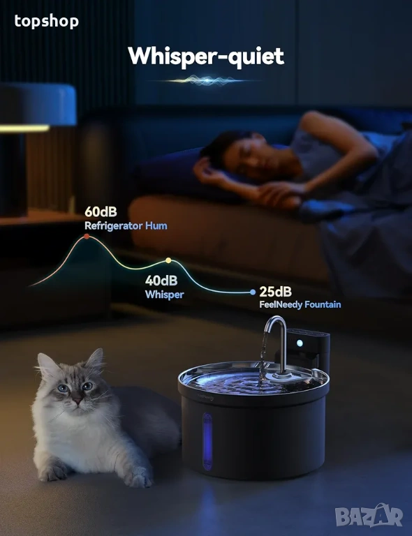 Продавам иновативен автоматичен фонтан за вода за котки и кучета FEELNEEDY модел FN-W08L-PB. Този диспенсър е проектиран да осигурява винаги прясна и филтрирана вода като същевременно ви дава пълна свобода на поставяне без досадни кабели.