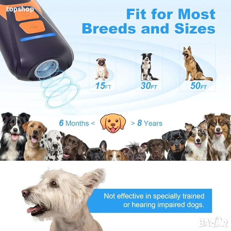 Две безопасни честоти Можете да избирате между фиксирана честота от 25KHZ и променлива честота между 22 и 29KHZ. Ултразвукът не се чува от човешкото ухо но привлича вниманието на кучето без да му причинява болка или стрес. Без ток без вибрация и без наранявания.