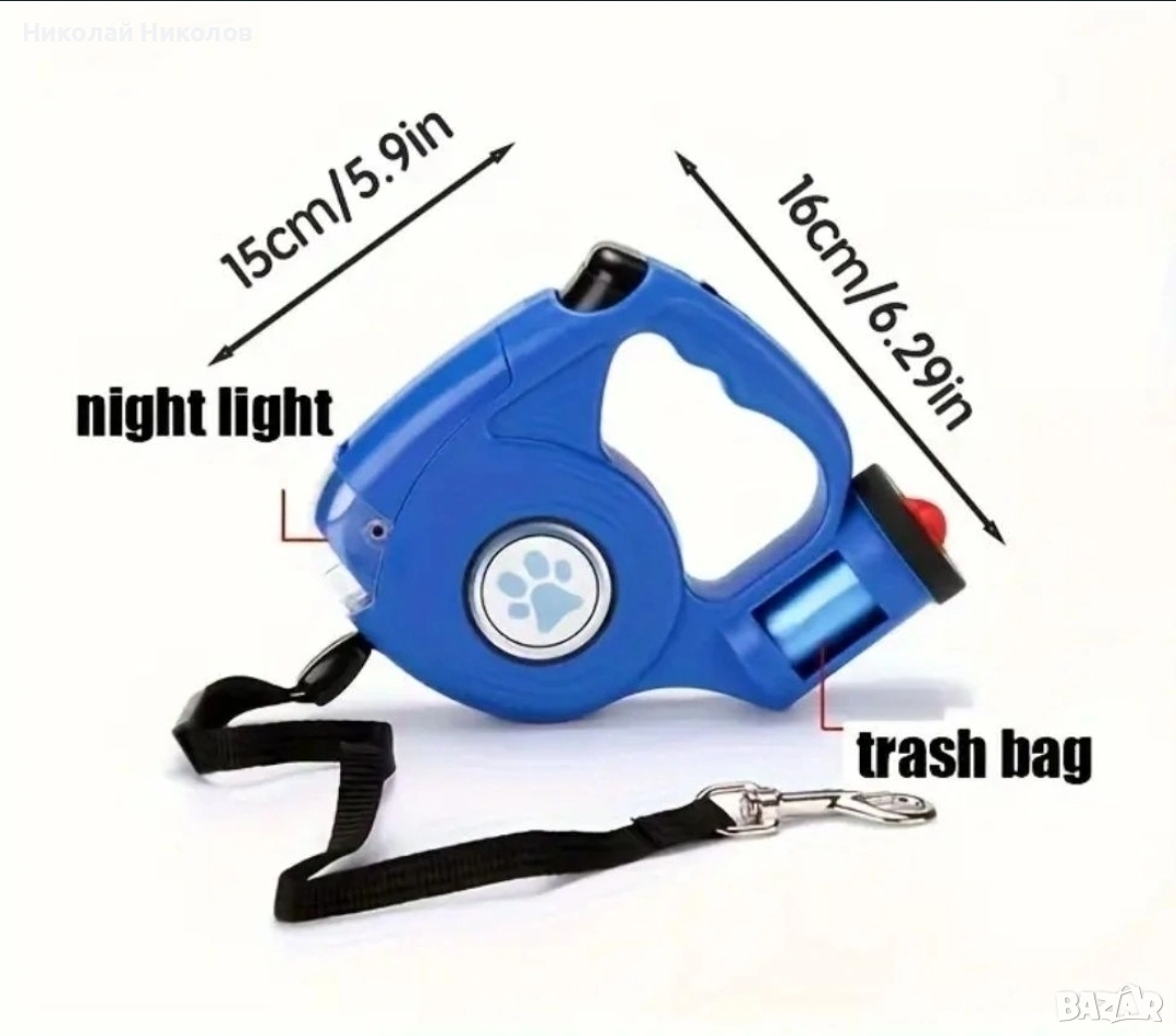 Продавам чисто нов повод за куче 5 метра с държач за торбички и фенерче. Подходящ за кучета до 35 кг. Изпращам с куриер или за Стара Загора е възможно лично предаване