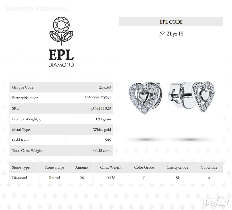 Обеците са закупувани от EPL Diamonds в Paradise Center, София и са от бяло злато с истински диаманти. Може да се провери на място в магазина с уникалния код, който е гравиран на самите обеци – към него има дигитален сертификат за точния модел и характеристики на бижутата.