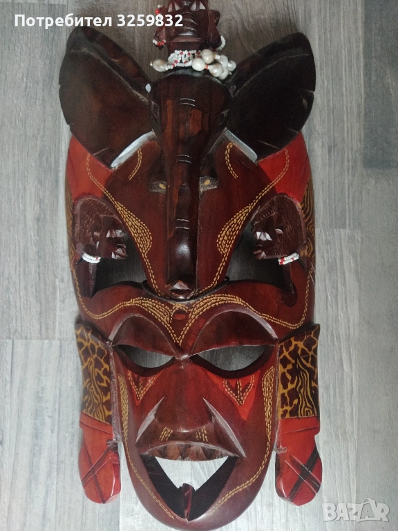 Автентична ръчно изработена дървена маска с традиционен племенен дизайн от Южна Африка. Това уникално изделие е закупено в Южна Африка и демонстрира отлично майсторство с богат червеникаво-кафяв (махагонов) байц, характерен за традициите на резба на племената Зулу, Кхоса или Зимбабвийските Шона.
