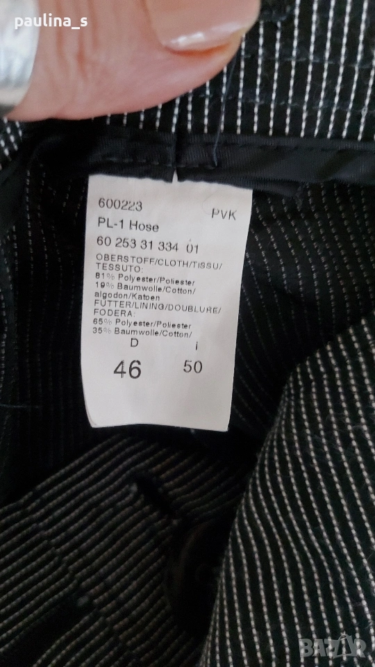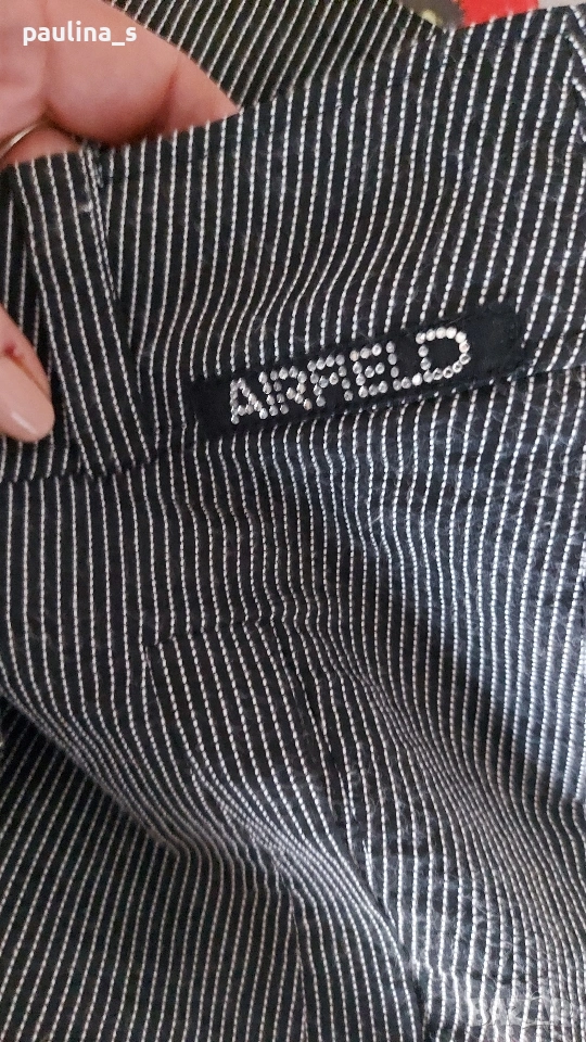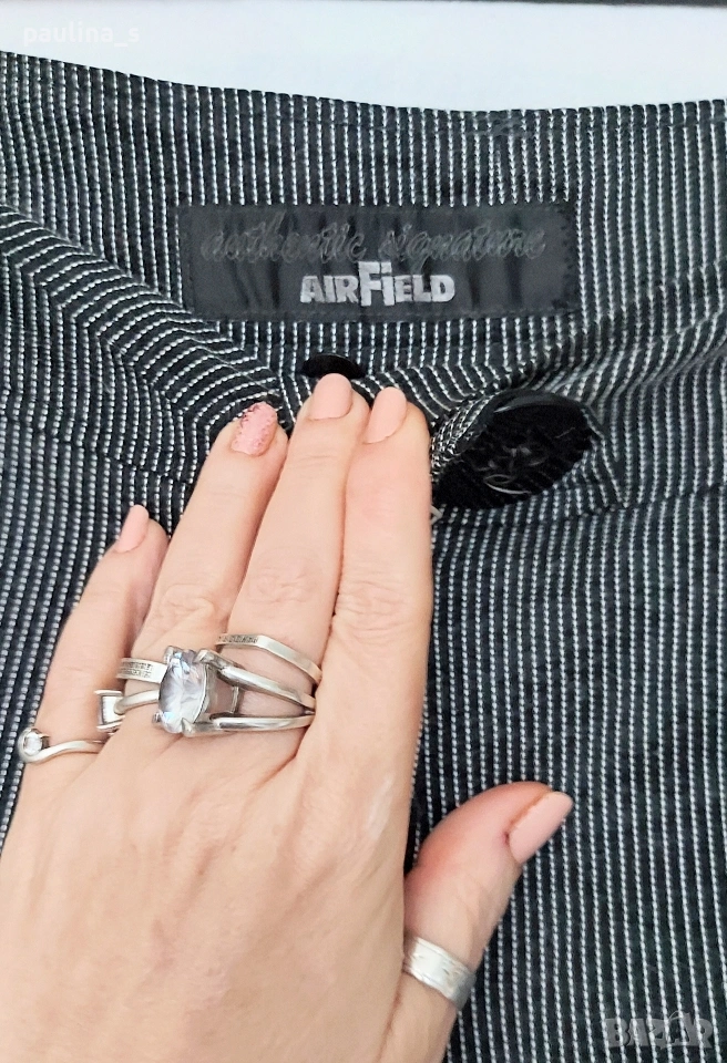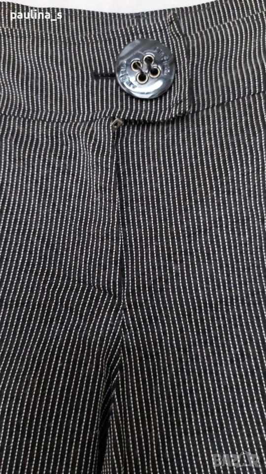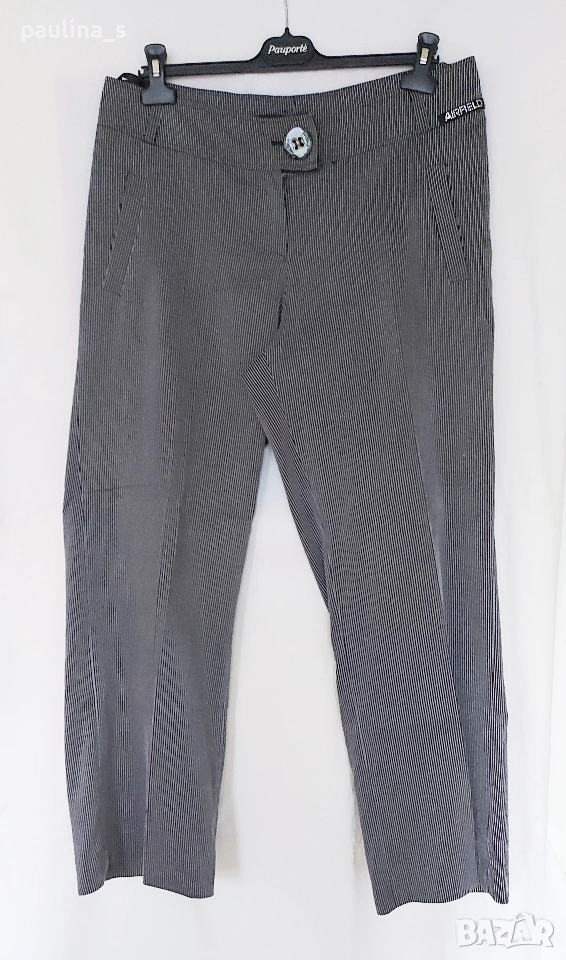 1️⃣. 2XL / 3XL - Винтидж! "Airfield". Цената е крайна, без пазарлъци 20 евро. Еластичен памучен панталон, голям размер с широки крачоли и леко ниска талия. Платът е тафта, тънък и немачкаем, джобовете не променят формата на ханша. Цветът е черен на бели райета. По етикет е 46EU, но става и за съседните, вижте мерките в обявата. Брандирано копче, декорациите са с камъни. Подходящ е за лято, изумителен е.