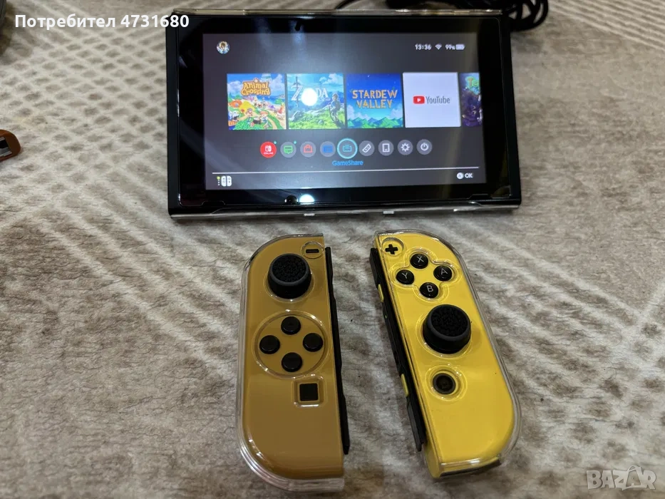 Комплект Nintendo Switch Let’s Go Eevee Limited Edition. В добро състояние с изключение на стойката, която не държи и затова съм сложил тиксото. Всичко по нея работи. Продавам я понеже не се ползва. Идва в пълен комплект - кутия, зарядни, станция и всичко, което си ѝ принадлежи.Изпращам по Еконт и Спиди. За въпроси или повече снимки на лс и моля без коментар на цената!