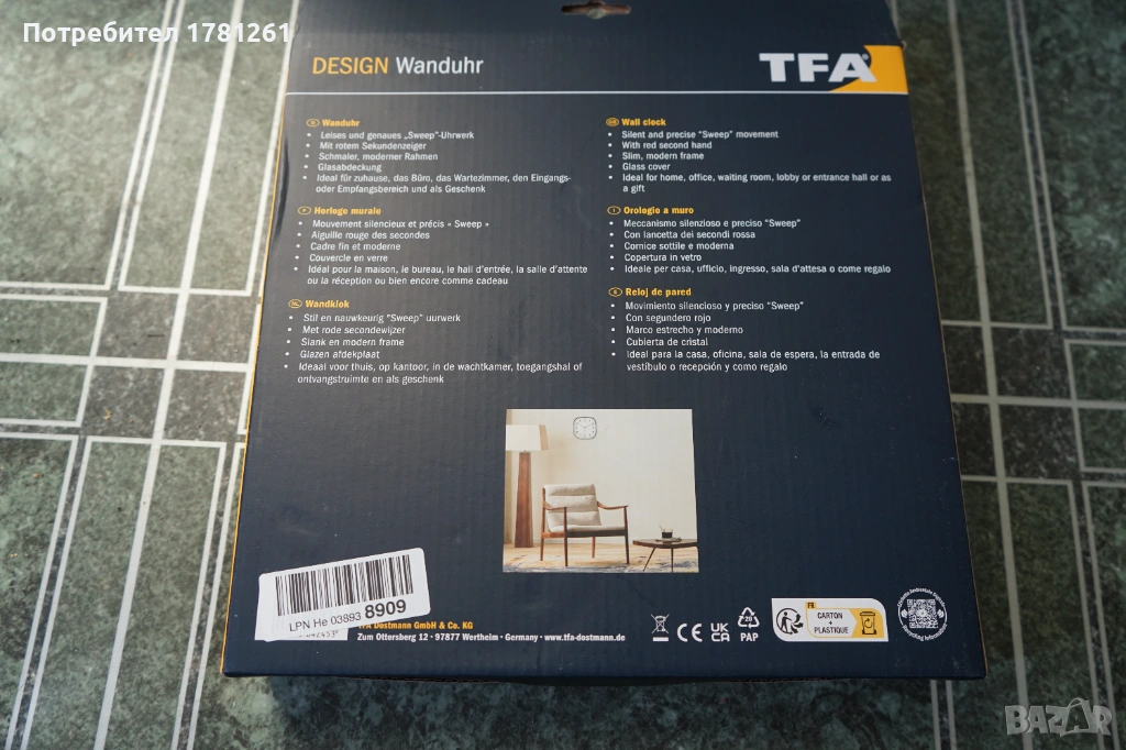 Стенен часовник TFA, снимка 1 - Стенни часовници - 53400190 Стенен часовник TFA, снимка 2 - Стенни часовници - 53400190 Стенен часовник TFA, снимка 3 - Стенни часовници - 53400190 Стенен часовник TFA, снимка 4 - Стенни часовници - 53400190 1/4