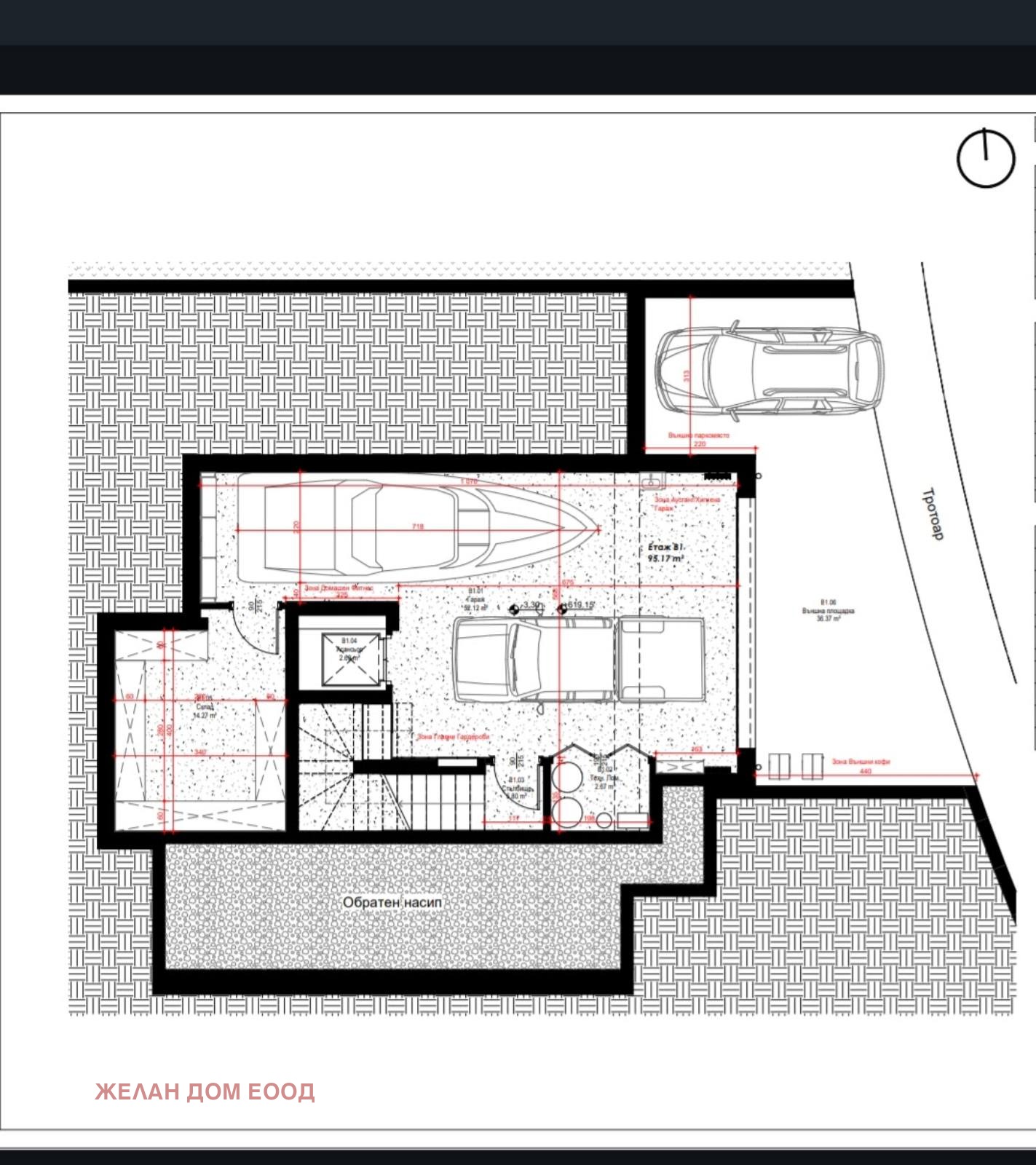 Приземният етаж се състои от: двоен гараж от 80 кв.м. вътрешно стълбище, две сервизни помещения и Асансьор водещ до горните два етажа.