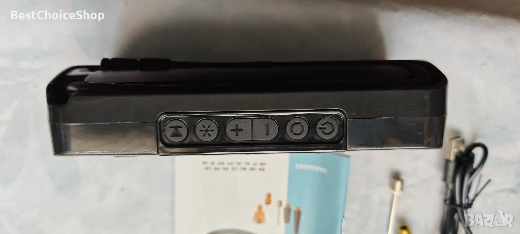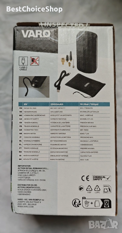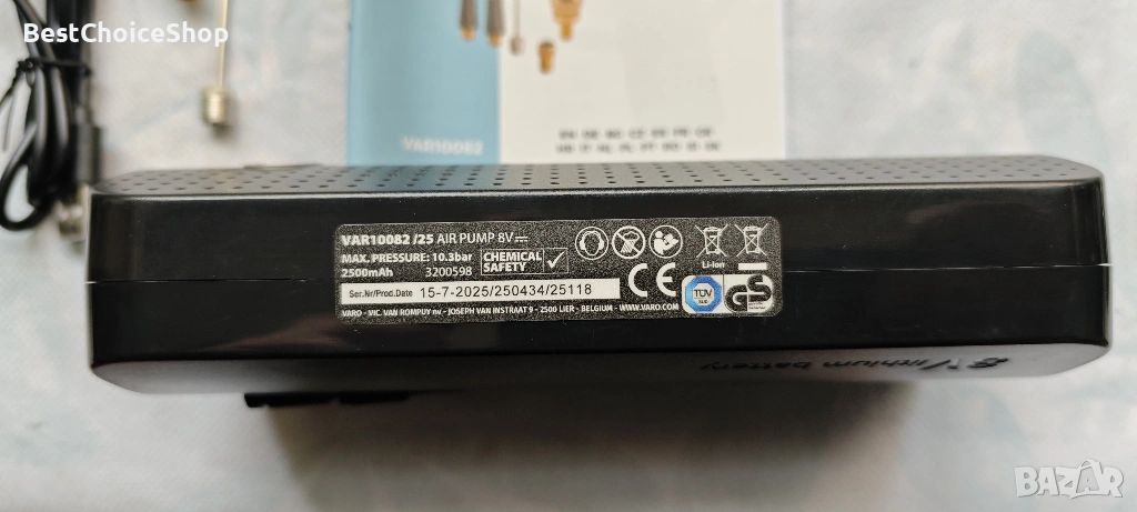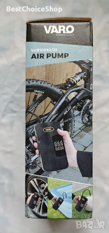 Продавам акумулаторна въздушна помпа VARO PowerTools, модел VAR10082/25. Компактна, мощна и удобна за автомобил, велосипед, мотор, топки и надуваеми изделия.