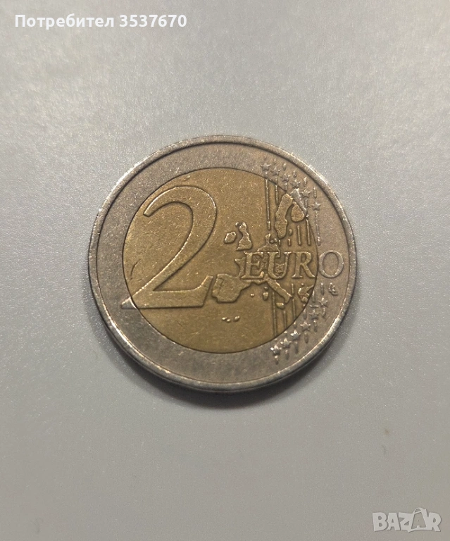 Оригинална монета 2 евро от 2002 година, издадена от Гърция, с характерната буква „S“ в една от 12-те звезди на външния ринг. Това е интересна колекционерска вариация, която показва, че монетата е отсечена в монетния двор на Финландия („S“ = Suomi), тъй като през 2002 г. Гърция частично е използвала чужди монетни дворове за производството на своите евро монети.