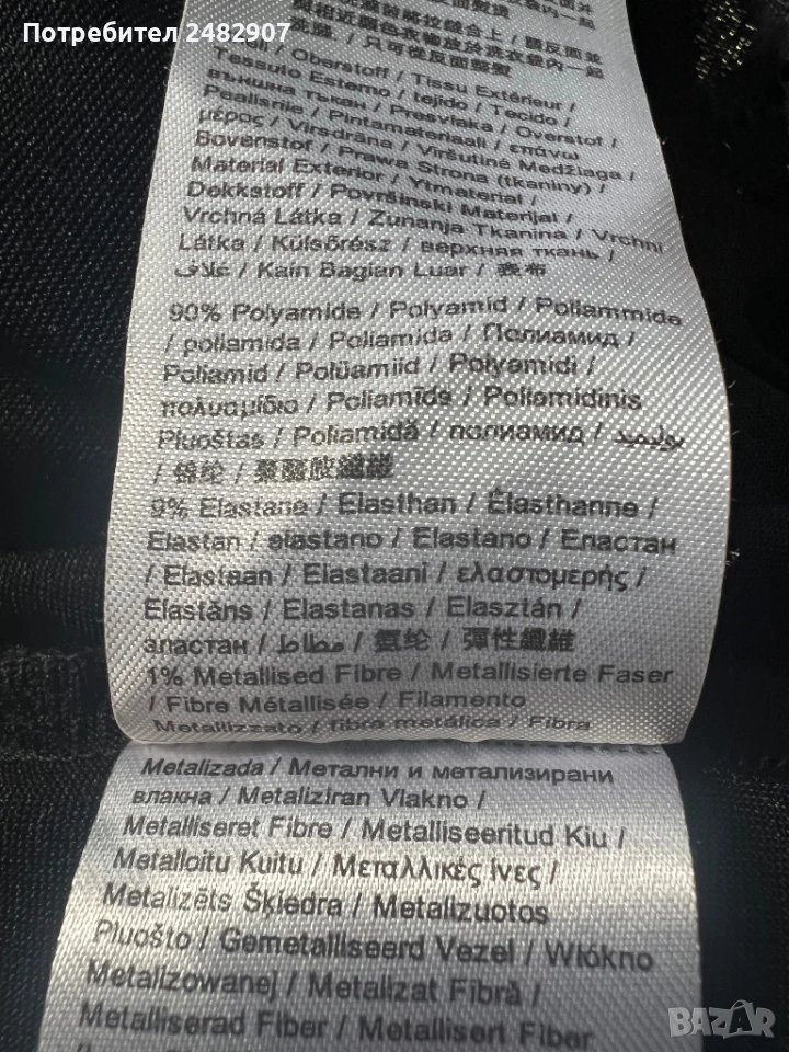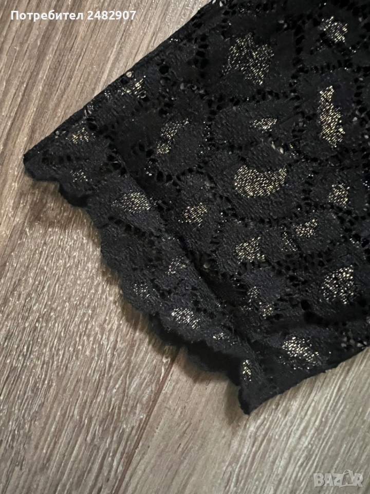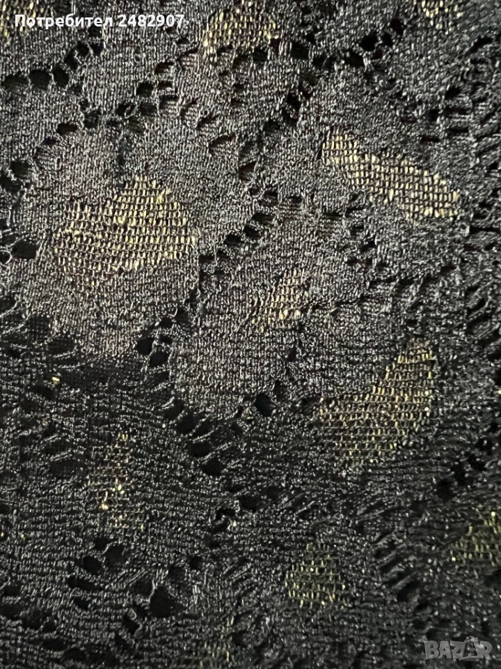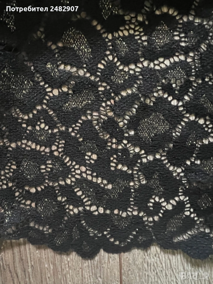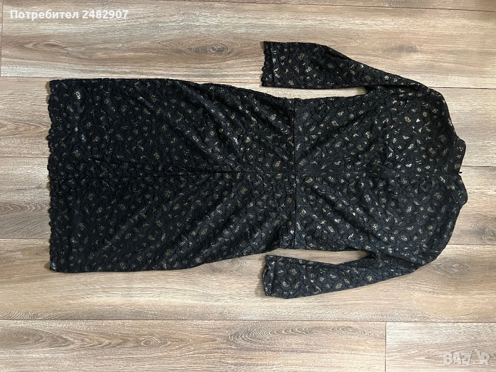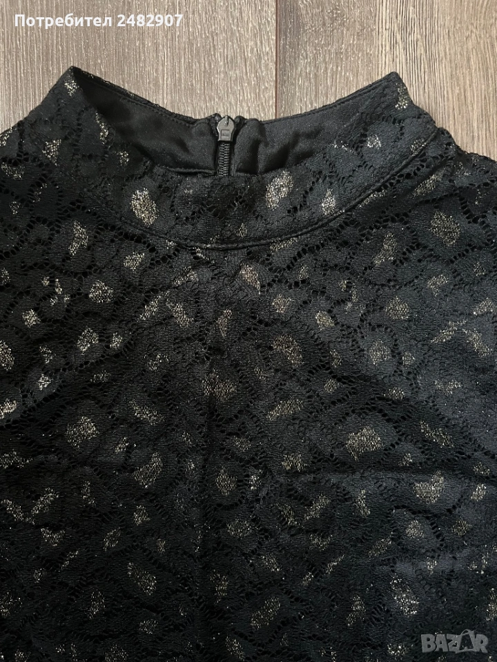 Ефектна черна дамска рокля с блестящ ефект, дантела и подплата, размер S. Съдържа 90 % полиамид, 9 % еластан и 1 % метални нишки (ламе). Ширина в раменете - 39 см, ширина под мишниците - 43 см, ширина в талията - 38 см, ширина в долната част - 47 см, дължина от рамото до долу - 101 см, дължина на ръкава от рамото - 45 см, ширина на ръкава в долната част - 11 см. Обличана веднъж за повод, без забележки, неразличима от нова. Много красива и ефектна, закопчаване - със скрит английски цип на гърба. Дължина на ципа - 48 см.
