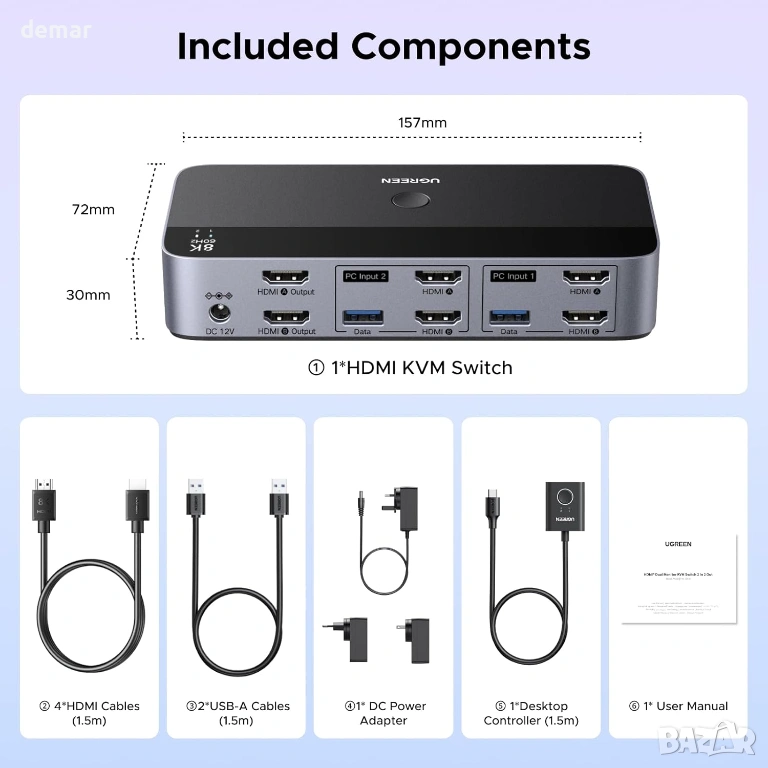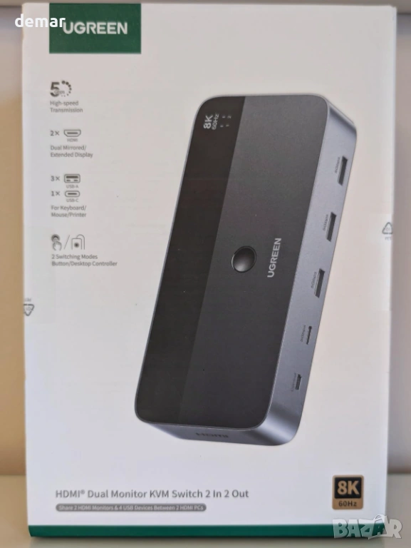 UGREEN 8K/60Hz HDMI 2.1 KVM превключвател за 2 монитора и 2 компютъра