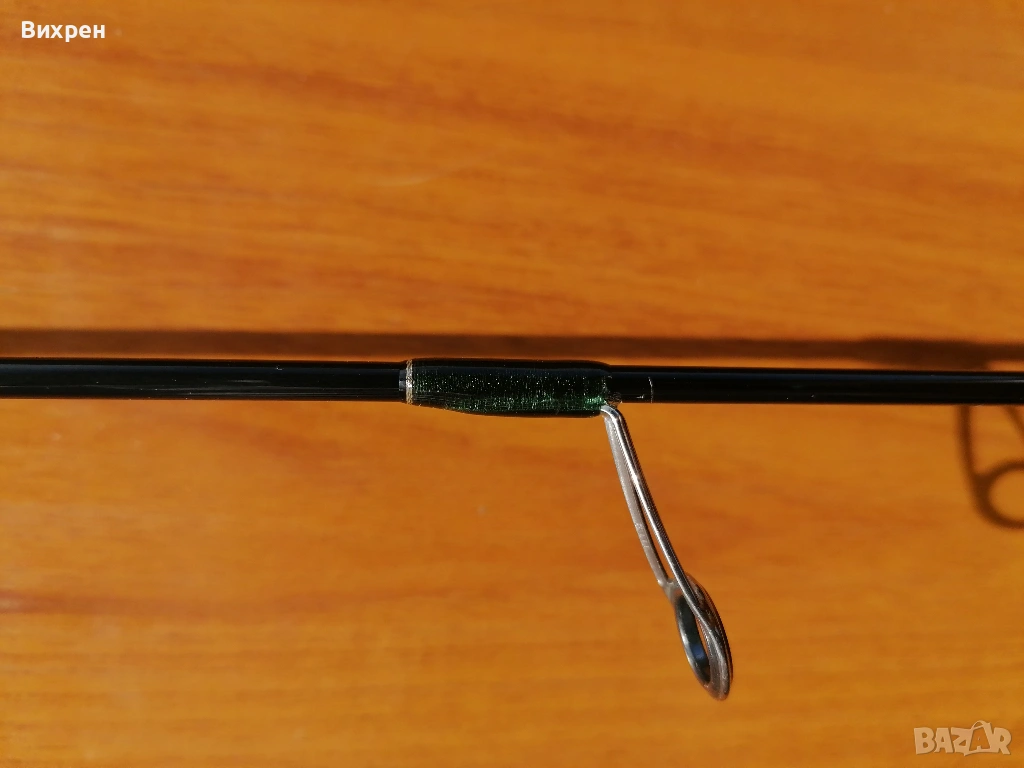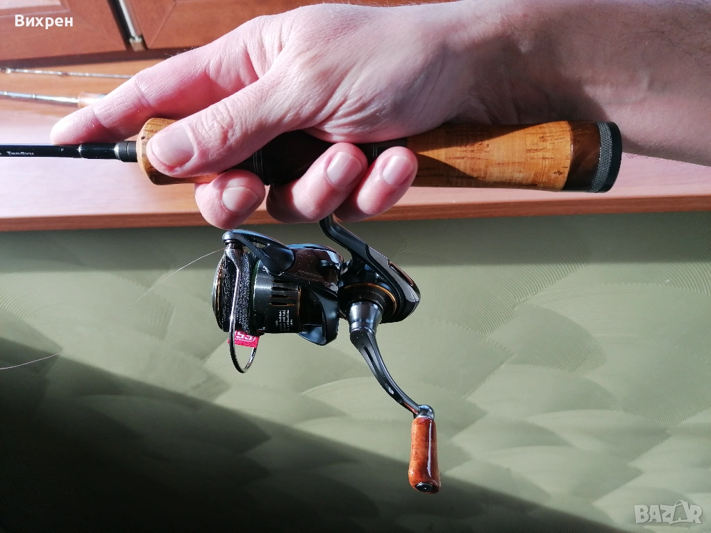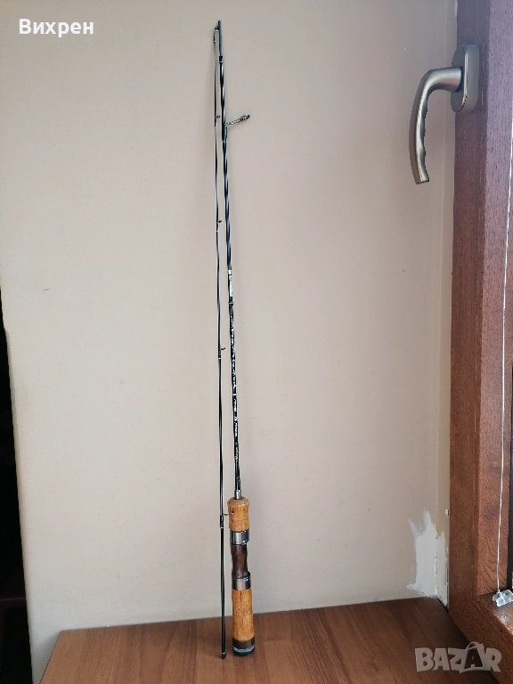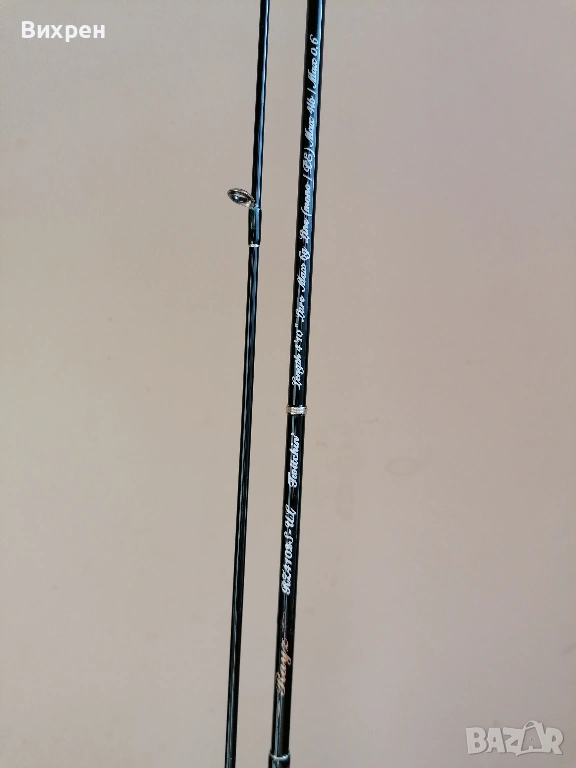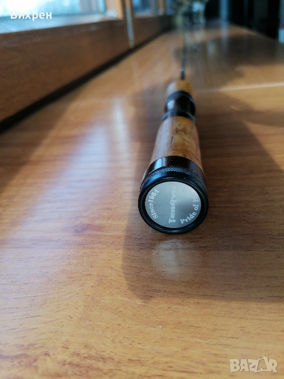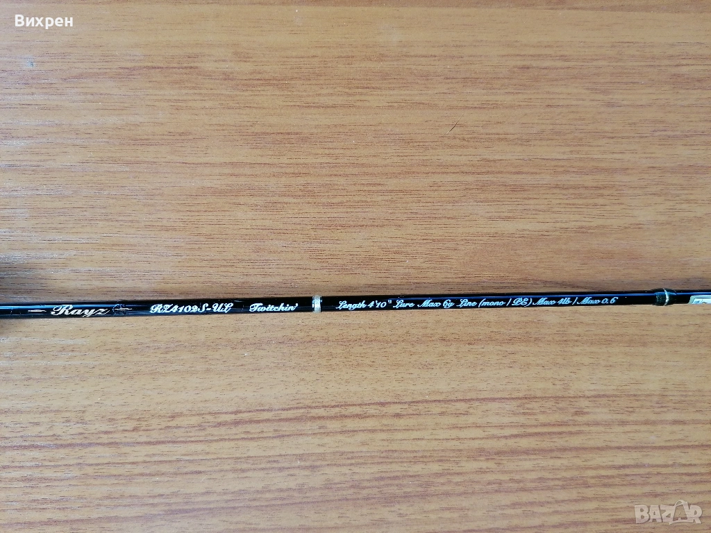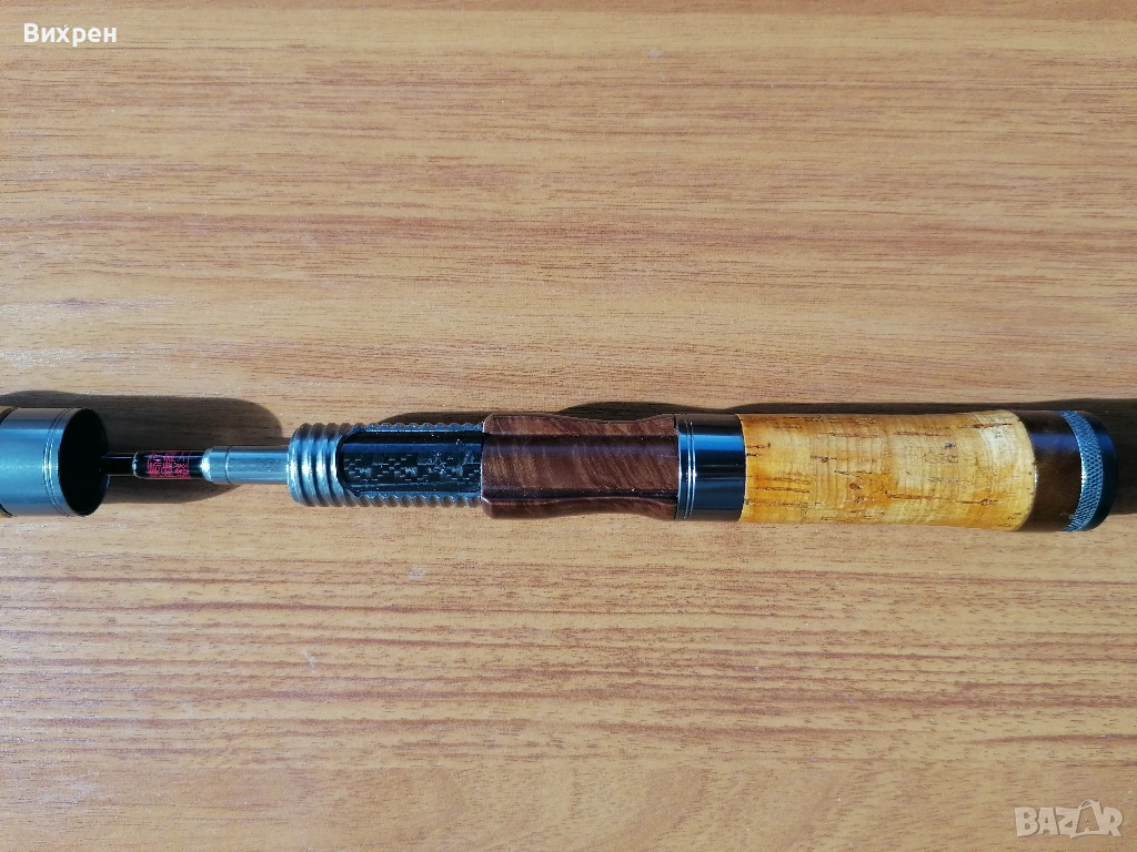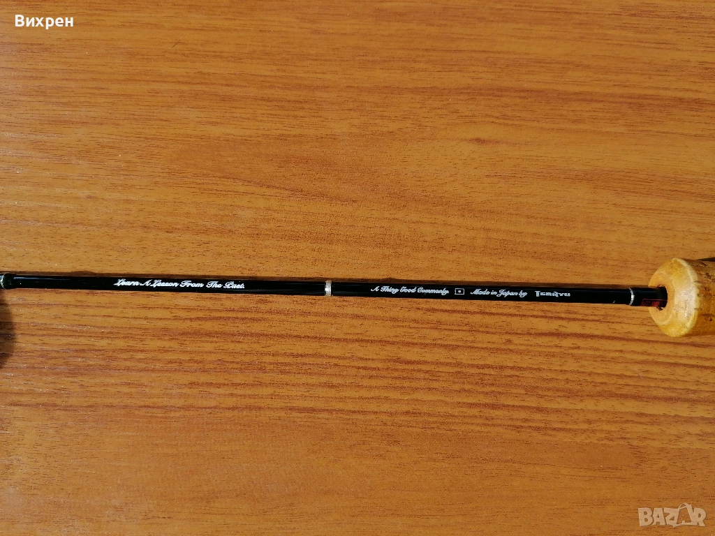 Поради непредвидени обстоятелства ми се налага да се разделя със следната пръчка: Tenryu Rays Twitchin RZ4102S-UL (4'10", Lure - 6 g, Line Max 4 lb). Дизайнът на пръчката е перфектен, като това е може би най-компактната и практична дръжка, която съм пробвал. Прогонката на детайлите е толкова добра, че при поставена макара не се получава никакъв луфт между винта за стягане и дървената вложка, като усещането при държане е страхотно. Всичко това е видимо от снимките. Импрегнирал съм корка с шеллак (естествена смола, с която се правят финишите на най-скъпите бутикови музикални инструменти от времето на Страдивари до ден днешен), от където идва по-жълтеникавия оттенък на корка, за да не попада мръсотия в него, но и има малко по-ретро визия. Това правя на всичките си пръчки с коркови дръжки, за да ги съхраня и от хигиенна гледна точка. Ако все пак бъдещият собственик не харесва идеята, шеллакът се разтваря със спирт, така че може лесно да се почисти с памучен тампон. Пръчката я купих втора употреба, така че има леки следи от надрасквания по лака, като например над конците при горната снадка, където при транспортиране се е протривал в грапавия алуминиев ринг в долната част на дръжката (вижда се на една от последните снимки). Пробвах я само със силикони (глави под 1 гр) на откриването, така че нямам обективно мнение, освен удобството при риболов, както споменах по-горе. Давам я с леко неопреново калъфче, уви не разполагам с тубус, с който евентуално да я изпратя до друг град.
