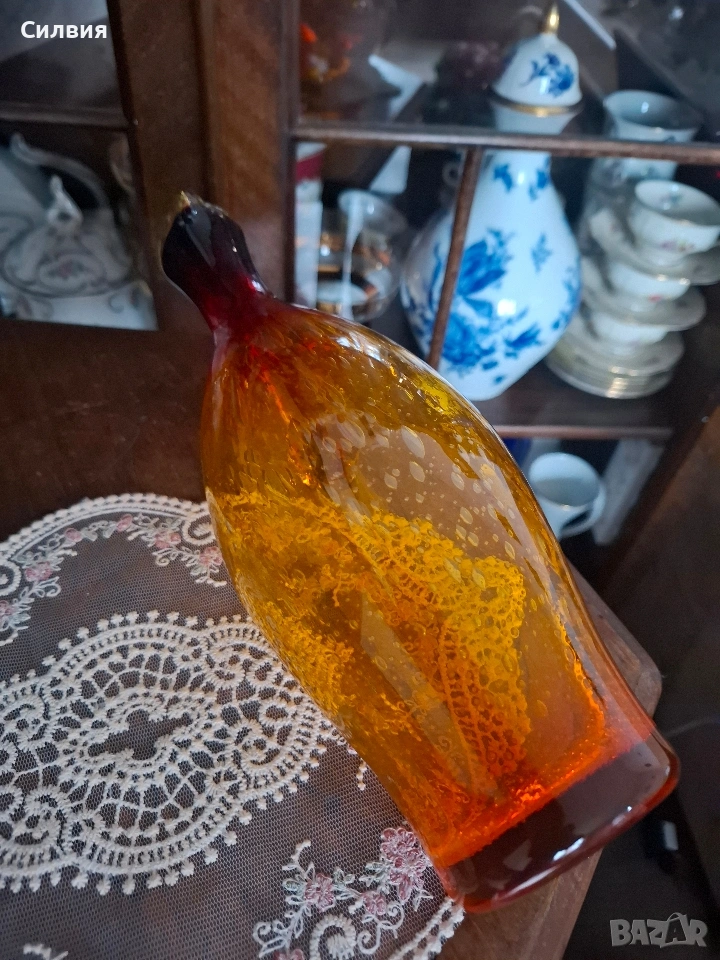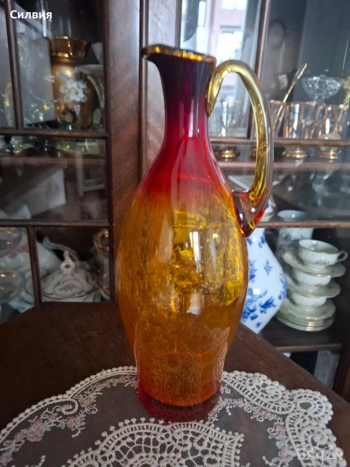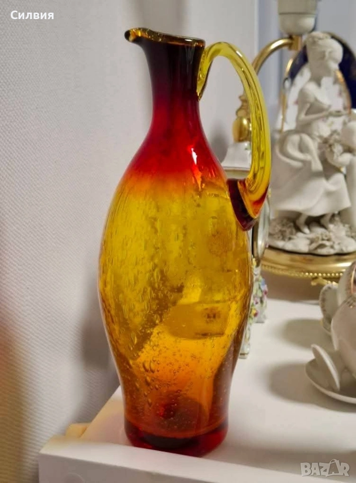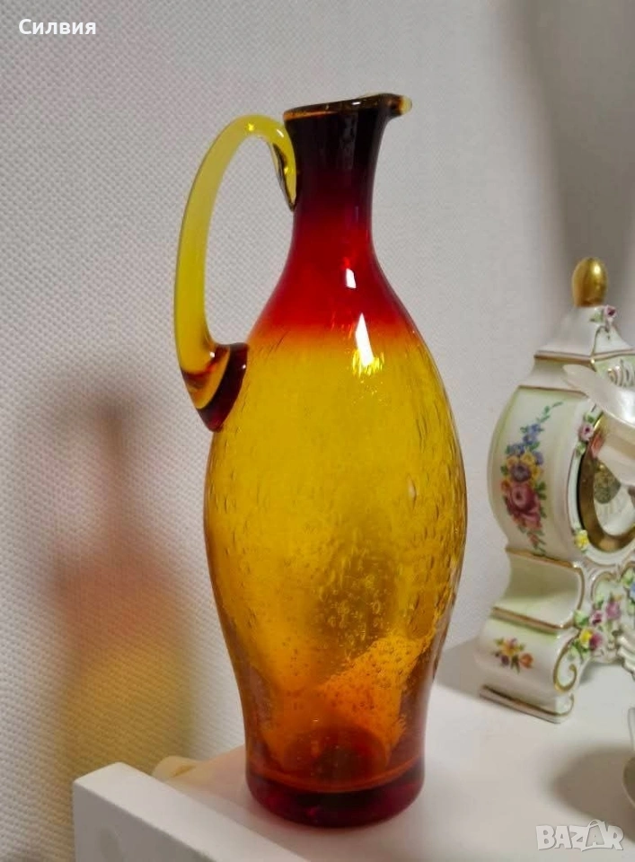 кехлибар. Корпусът е изработен по метода Bullicante с контролирани въздушни мехурчета, които улавят светлината и създават триизмерен ефект. Скритото съкровище (UV Glow): Стъклото притежава магическо свойство – под въздействието на ултравиолетова светлина (UV), жълтата част на каната излъчва яркозелена флуоресценция. Това показва присъствието на уран в състава, което я прави силно желан колекционерски обект (Uranium/Vaseline Glass). Комбинацията от червена „Амберина“ и уранова флуоресценция е по-рядка от стандартното зелено ураново стъкло. Детайли на изработката: Ръчно приложена дръжка в контрастен цвят. Полиран понтил (Polished Pontil) на дъното – белег за висок клас ръчна изработка, характерен за майсторите от Мурано (Италия) или елитни студиа от 50-те/60-те години. Размери: Височина 25 см; Диаметър на основата 6.5 см. Цена 8️⃣0️⃣€ 156,47лв ❥⊱╮🩷☆♪ ░─❥⊱🩷✿L░o░V░e░❥─❥⊱🩷✿⊱╮🩷☆♪ღ