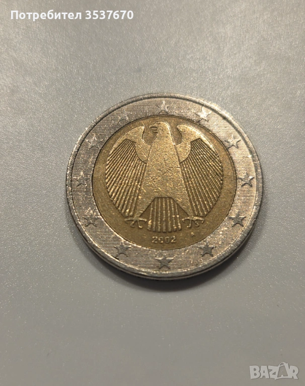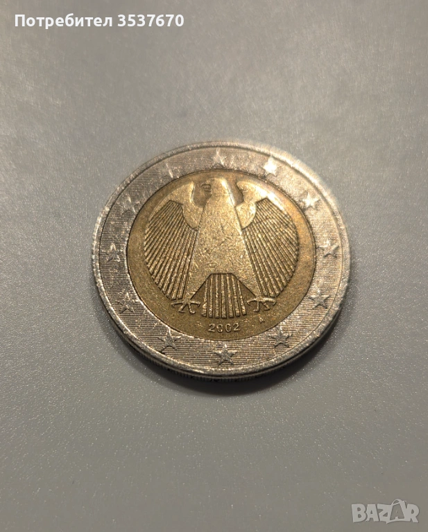 2 евро от Германия, сечена през 2002 г. На лицевата страна е изобразен традиционният символ на германския суверенитет – орел, заобиколен от звездите на Европа.