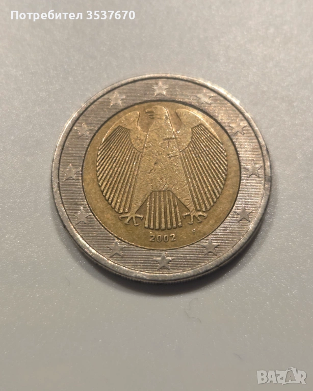 Това е монета от 2 евро от Германия, сечена през 2002 г. На лицевата страна е изобразен традиционният символ на германския суверенитет – орел, заобиколен от звездите на Европа.