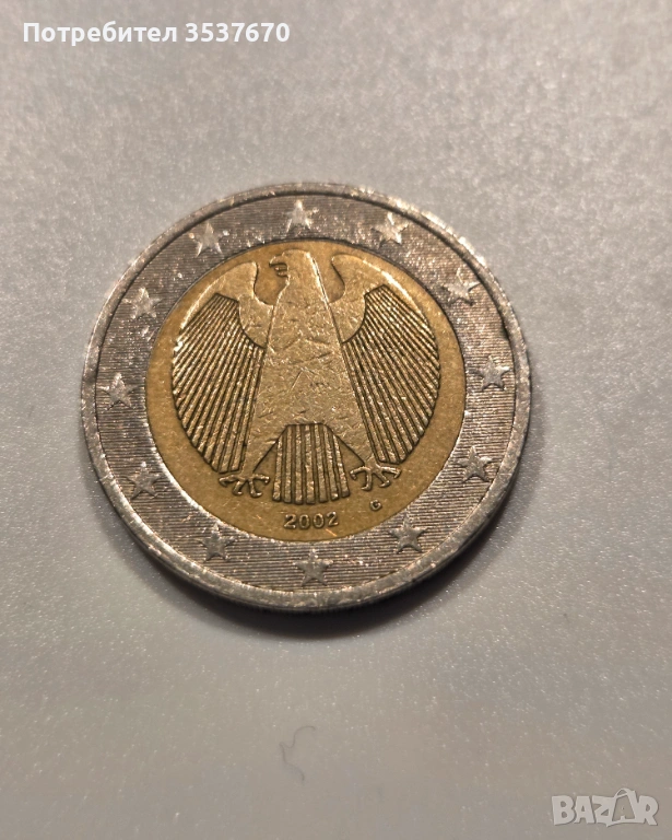 Това е монета от 2 евро от Германия, сечена през 2002 г. На лицевата страна е изобразен традиционният символ на германския суверенитет – орел, заобиколен от звездите на Европа.