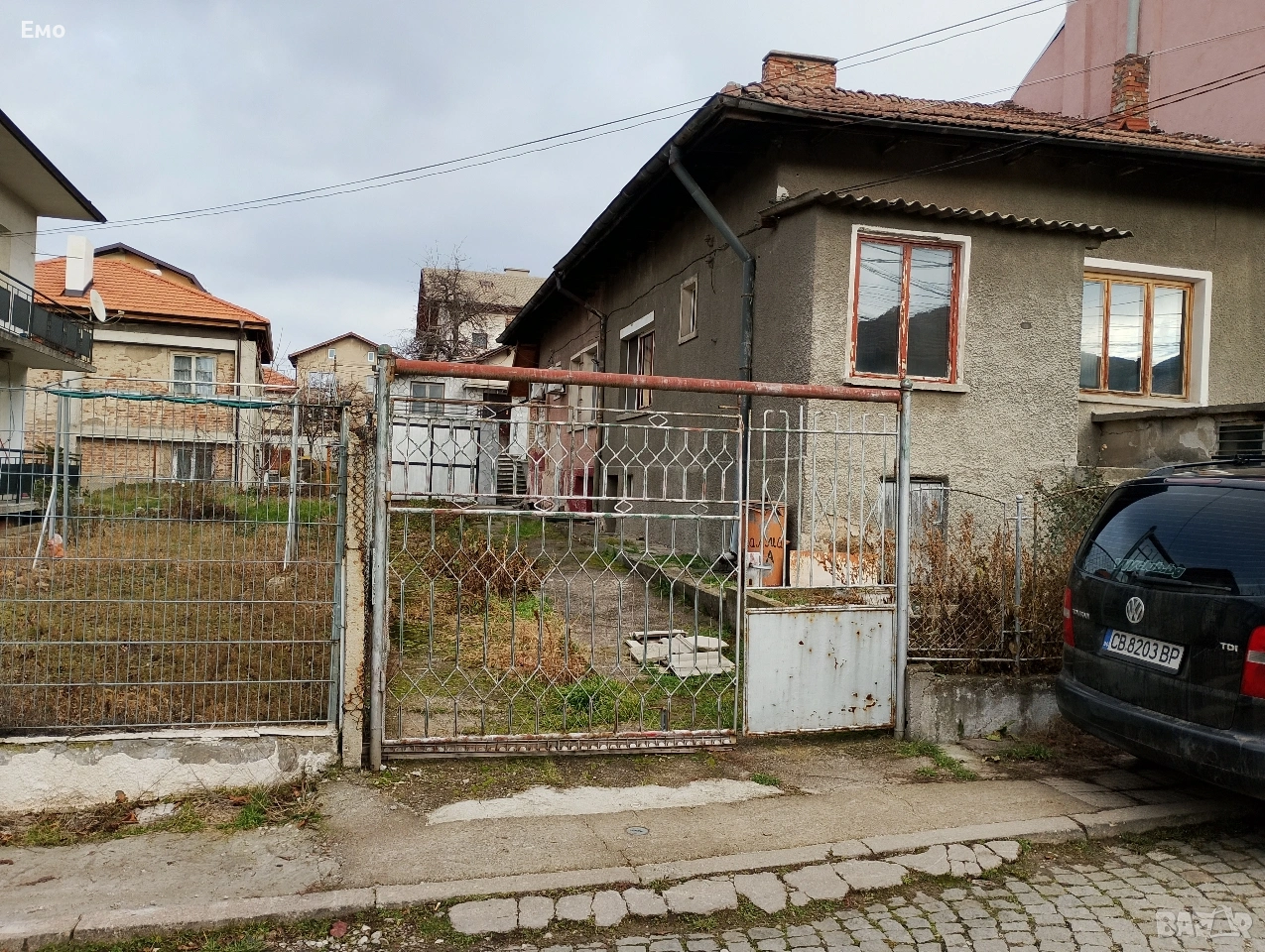 Половината от голяма и масивна едноетажна къща-близнак: задната половина с верандата! + отделната къща + големия гараж + 2 мазета + градинка и дългата алея, тухла и плоча (горна и долна) навсякъде, със собствен вход и за двете части на близнака!