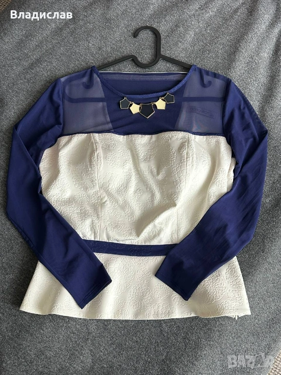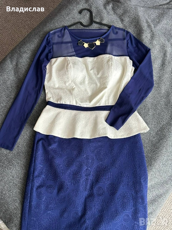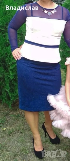 Комплектът се състои от елегантна блуза и пола. Стои много женствено и подчертава красиво фигурата.