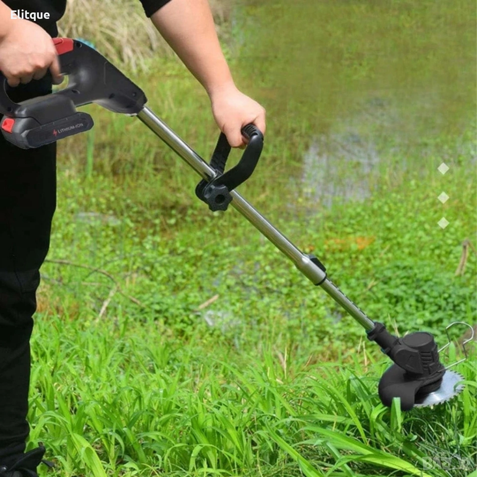 Предимства на безжичния тример: ⚡ Безжично удобство – работете където пожелаете, без кабели и контакти. 🔋 2 x 6000 mAh батерия – стабилна и ефективна работа. 🌱 Екологичен – без отработени газове, екологичен. 🔇 Тиха работа – идеална за жилищни комплекси и зони за отдих. 🪶 Лек дизайн (2,3 кг) – не уморява ръцете ви. 📏 Регулируема дължина (80–110 см) – приспособете се към вашата височина. 🔧 XXL комплект – различни остриета за всяка работа. 🛡️ Здрави материали – издръжливост в продължение на години. ⚙️ Технически спецификации: 🔹 Тип: Безжична косачка за храсти 🔹 Батерия: 2 x Li-Ion 6000 mAh 🔹 Скорост: 10 000 оборота в минута 🔹 Ширина на рязане: до 15 см 🔹 Тегло: 2,3 кг 🔹 Мощност: 180W 🔹 Регулиране: телескопична дръжка + ъгъл на наклон 🔹 Дължина: 80–110 см 🔹 Режещ елемент: остриета / диск