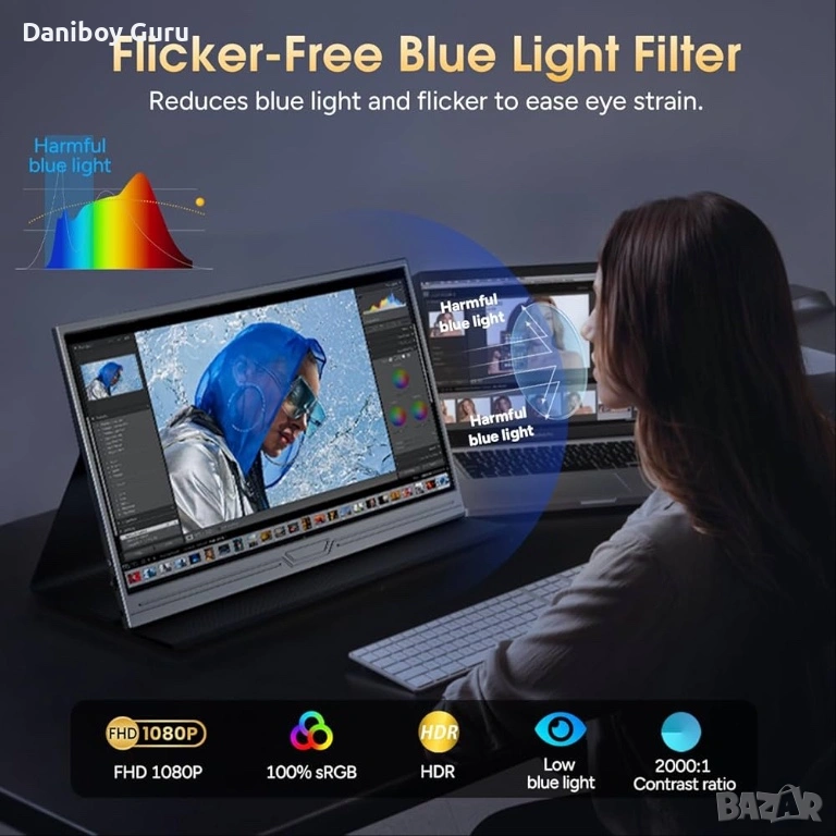 【HDR & Eye-Care монитор】 Преносимият екран с DC затъмняване за филтриране на вредната синя светлина и намаляване на трептенето, помага за защита на очите ви и намаляване на умората по време на дълги работни или учебни сесии. HDR технологията и матовият екран с антирефлексно покритие минимизират отраженията за ясен, подобрен контраст и комфортно гледане навсякъде.