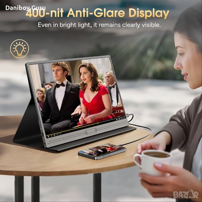 Преносим монитор с ясна картина】С Full HD 1920×1080 IPS дисплей с широк ъгъл на видимост от 178°, този преносим монитор за лаптоп осигурява ясна и остра картина от всеки ъгъл. Яркостта от 400 cd/m² и екранът с антирефлексно покритие осигуряват отлична видимост дори при силна светлина. Идеален за работа, игри и многозадачност в движение.