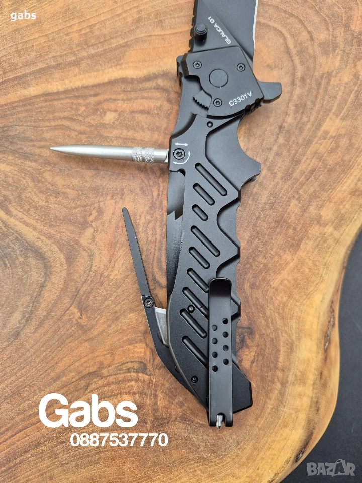 • острие за чупене на стъкло,заключващ се шип и сгъваем резец за въжета и колани