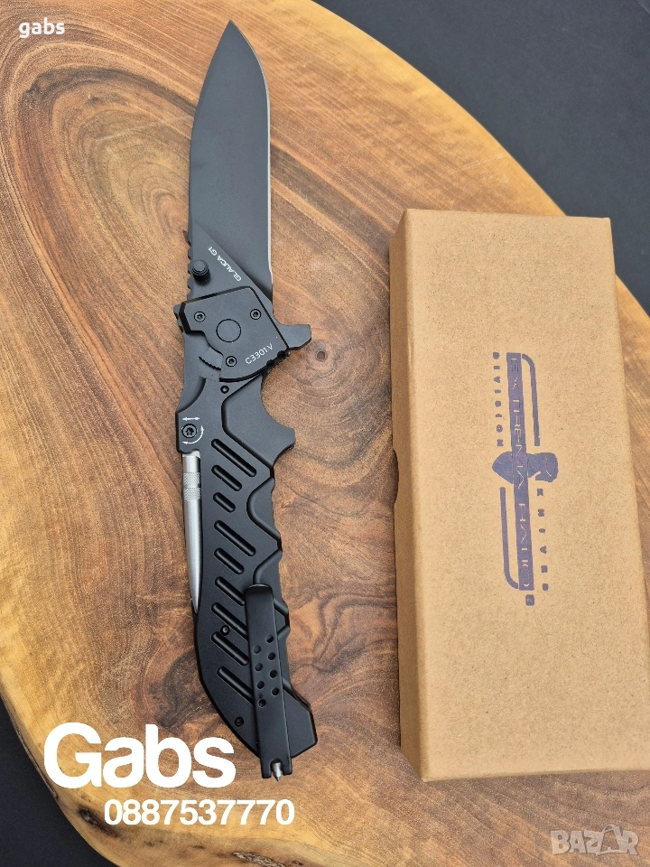 Системата за заключване на острието е LINER-LOCK, към която е добавен втори предпазен механизъм, който се управлява ръчно. Drop point острието е изработено от стомана Böhler N690, закалена до 58 HRC с класическо черно покритие.