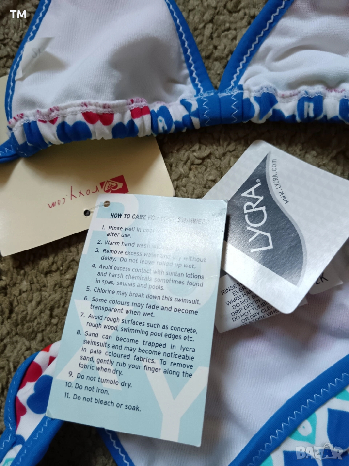 Нов бебешки бански Roxy 3-6 месеца Комплект от долнище, горнище и къси гащи. Талията на долнището е 42 см, а на късите гащи - 50 см с връзка за пристигане.