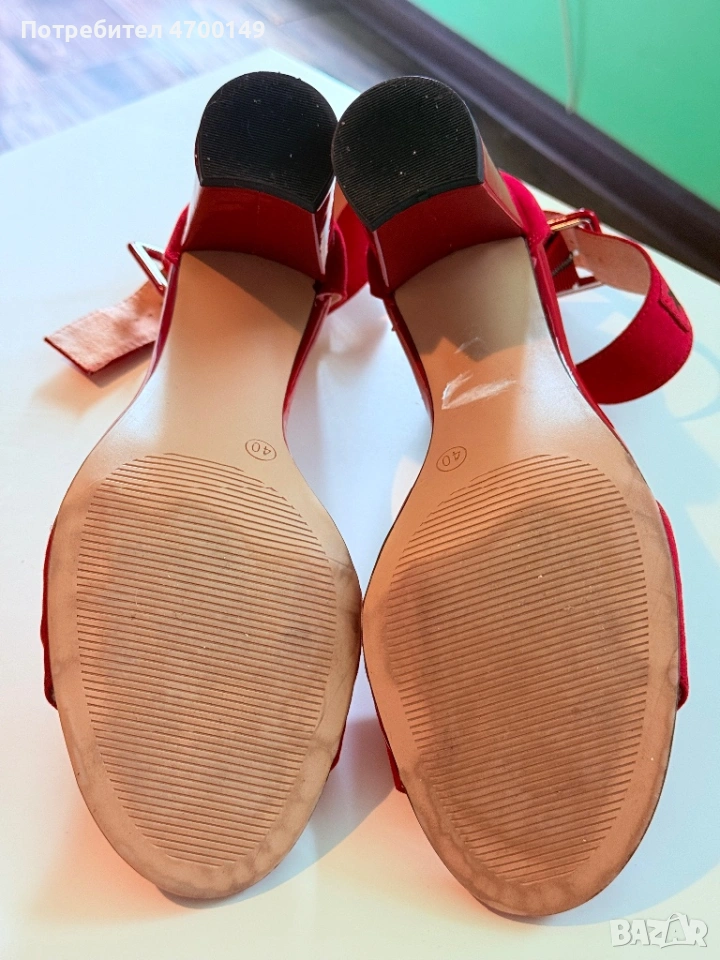 Дамски сандали на висок ток в червен цвят. Обувани само три пъти, в много добро състояние. Номер 40, от велур. Височина на тока 9 см.