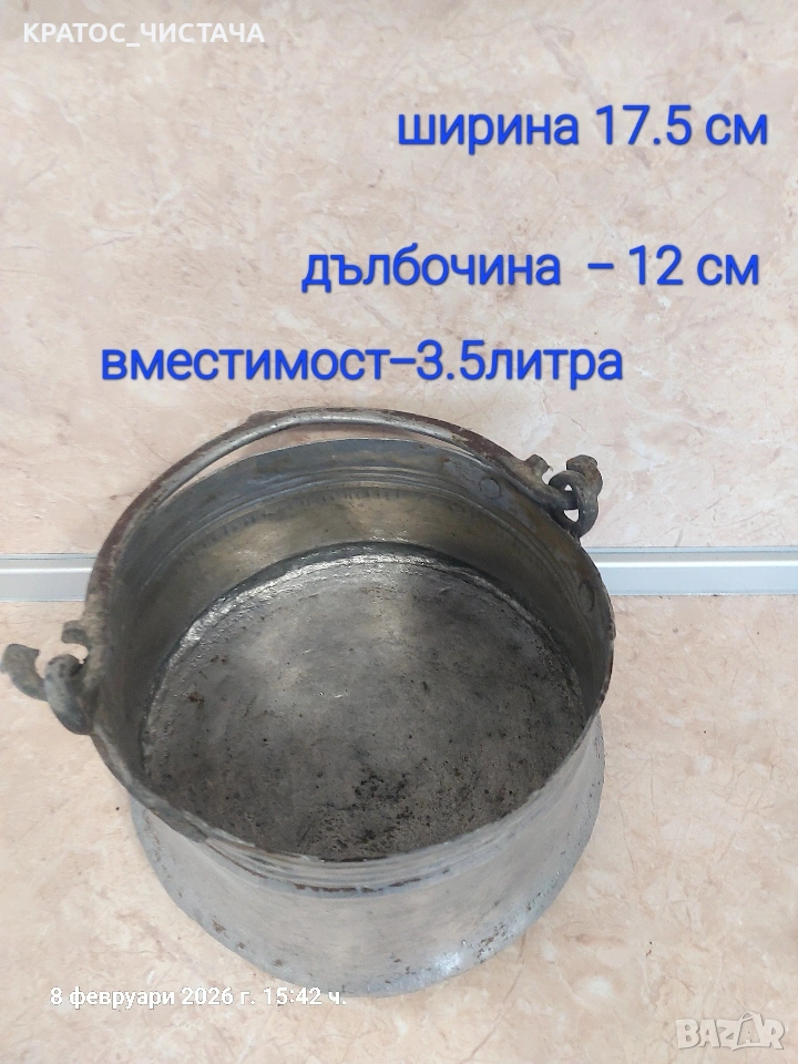 Продавам Бакър Ширина 17.5 см дълбочина около 12 см вместимост около 3.5 литра Бакъра е здрав не е пукнат няма течове , проверен е. Бакъра е в сравнително добро състояние.