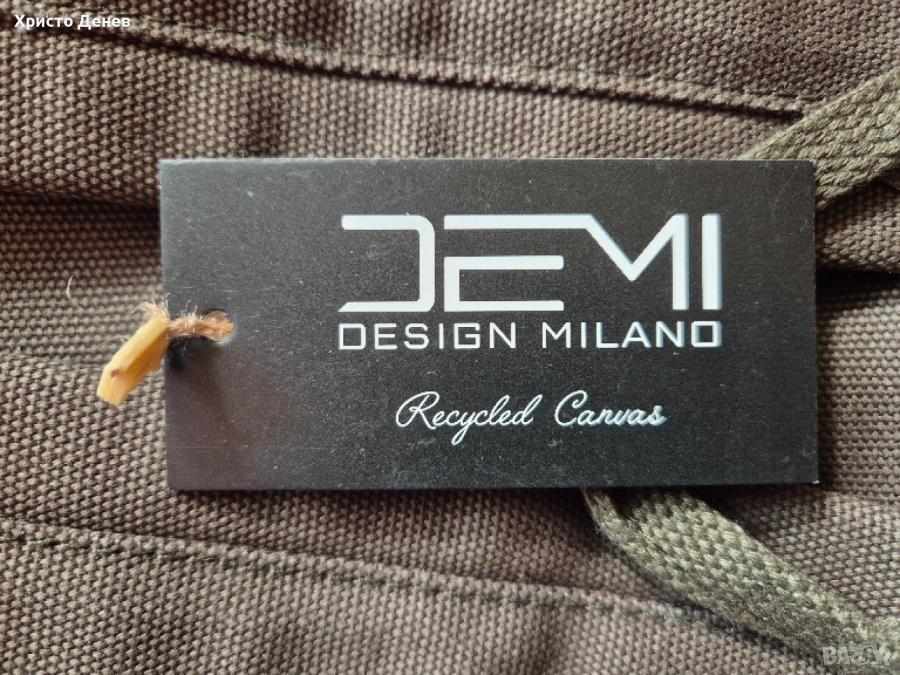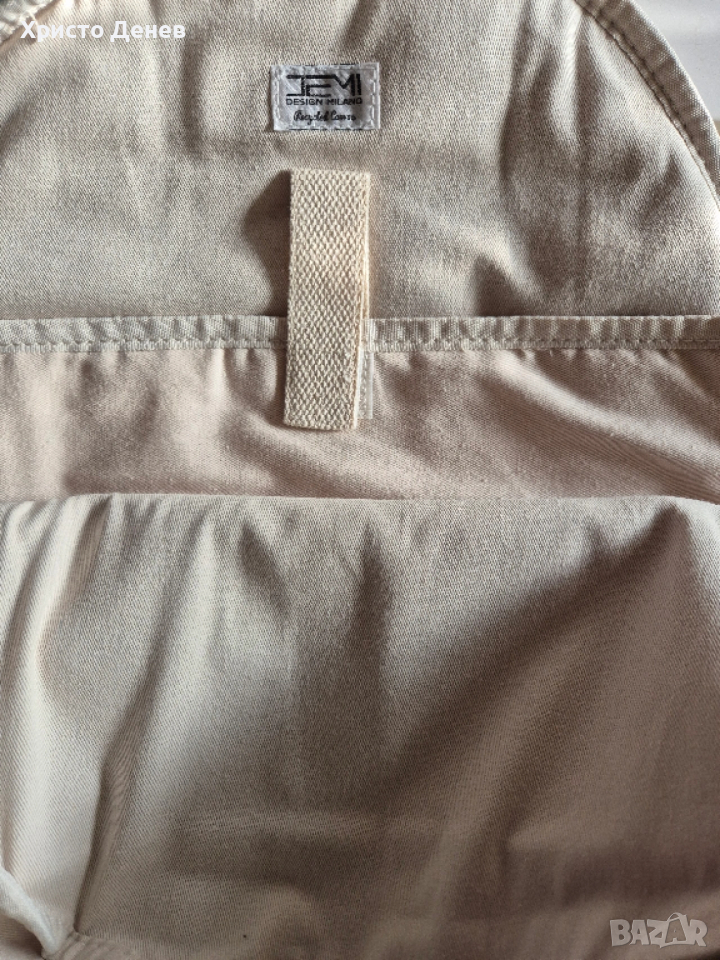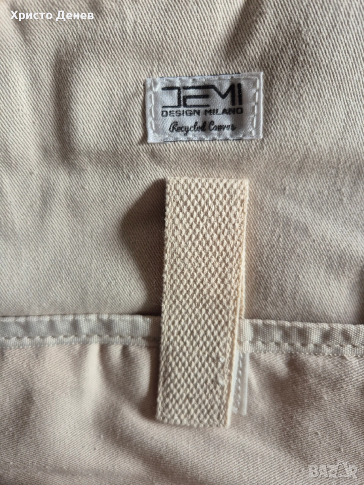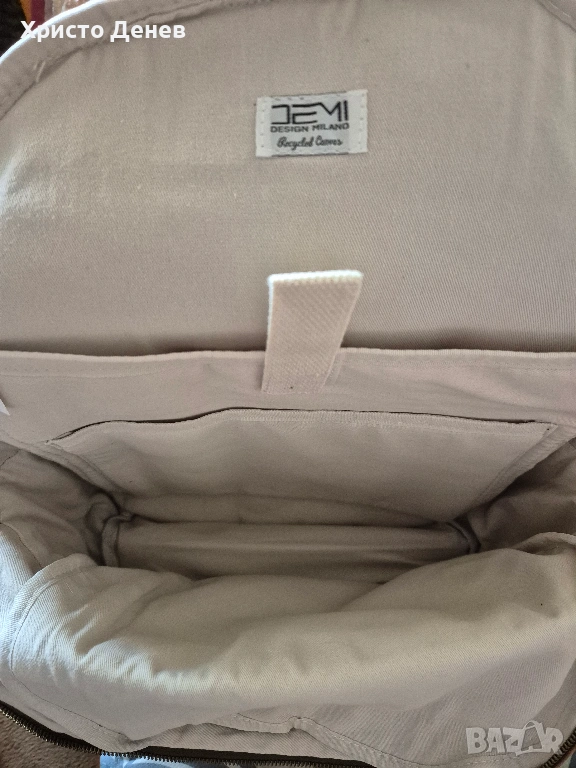 Продавам раница дизайнерска DEMI Design Milano Деми дизайн Милано, еко материал, внос от Италия. Материал 100% памук - 60% рециклиран и 40% стандартен. Стабилен плътен материал и кожени кафяви велурени украсителни ленти, метални ципове. Подплатено отделение за лаптоп. Мек бежов плат приятен за пипане от вътрешната страна. Подплатени гръб и стабилни презрамки, преден джоб с цип и страничен джоб за бутилка. Цвят тъмно зелен. Размер 42х13х13 см. Красива и надеждна, за ценители. Чисто нова, с оригиналните етикети, не е ползвана и един път.