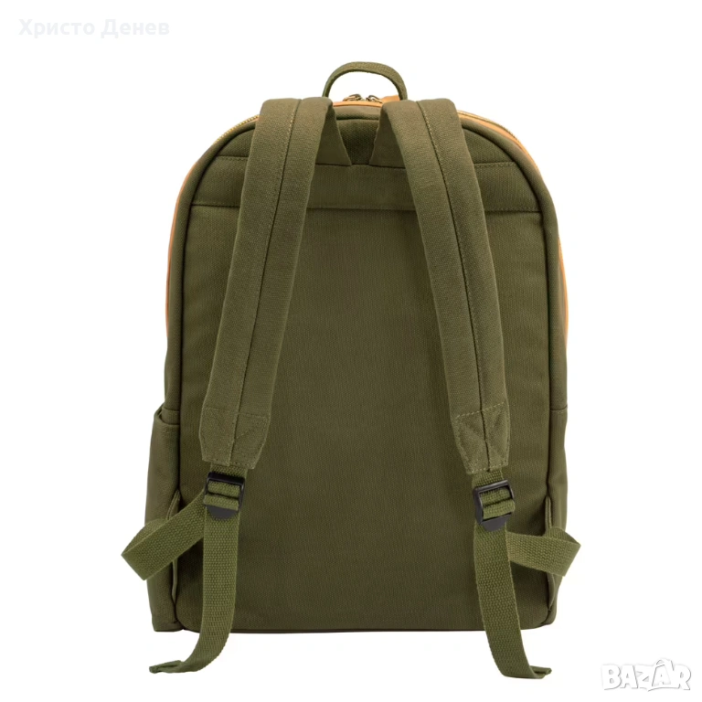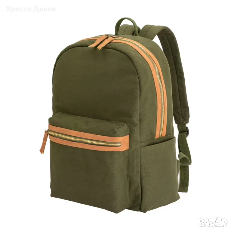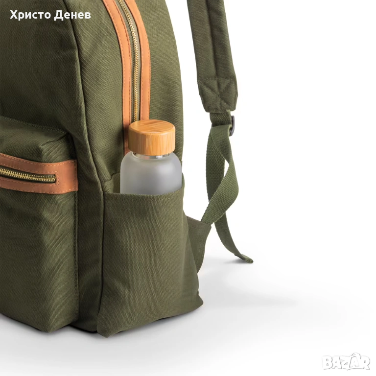 Продавам раница дизайнерска DEMI Design Milano Деми дизайн Милано, еко материал, внос от Италия. Материал 100% памук - 60% рециклиран и 40% стандартен. Стабилен плътен материал и кожени кафяви велурени украсителни ленти, метални ципове. Подплатено отделение за лаптоп. Подплатени гръб и стабилни презрамки, преден джоб с цип и страничен джоб за бутилка. Цвят тъмно зелен. Размер 42х13х13 см. Красива и надеждна, за ценители. Чисто нова, не е ползвана и един път, с картоненият етикет.