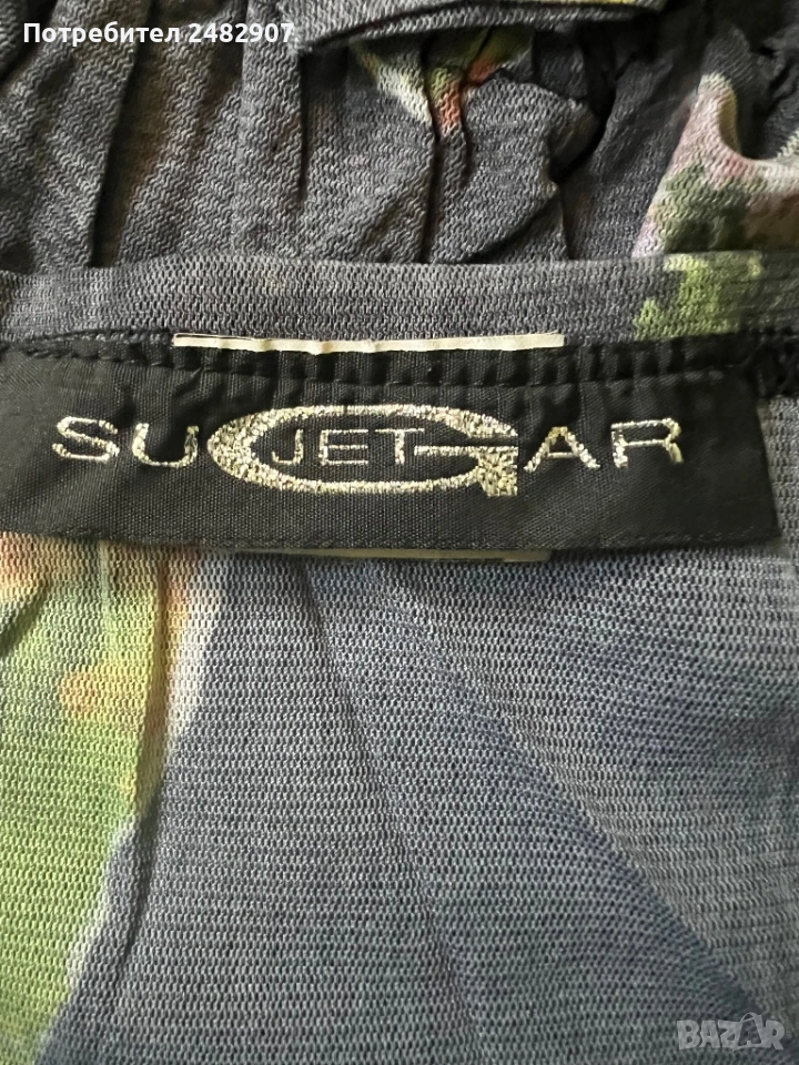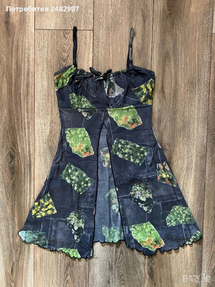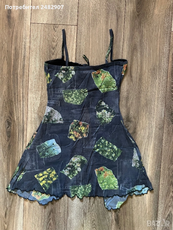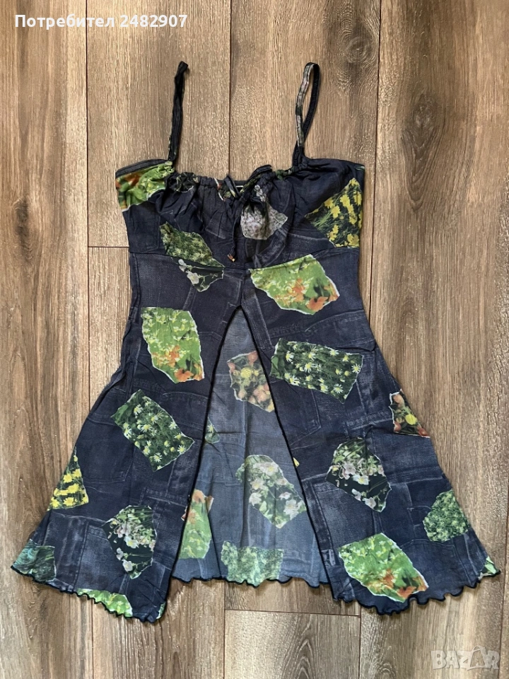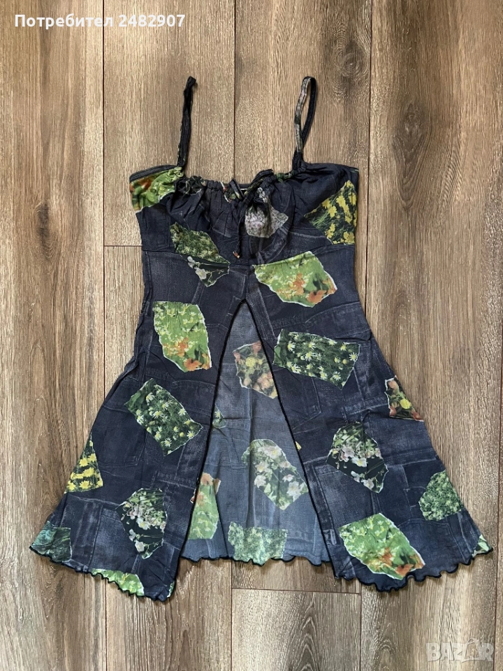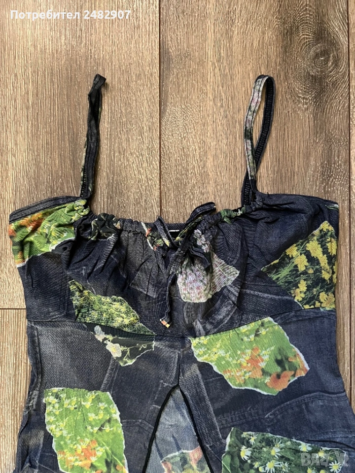 Ефектен дамски потник - тюл, размер S. Съдържа 100 % полиамид. Ширина под мишниците - 34 см, ширина в долната част - 71 см, дължина от горната част на презрамките до долу - 72 см (отзад) и 79 см (отпред). Много запазен, почти не е използван, с отворена предна част.