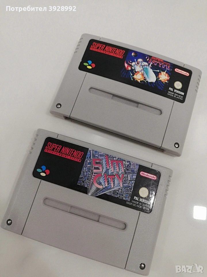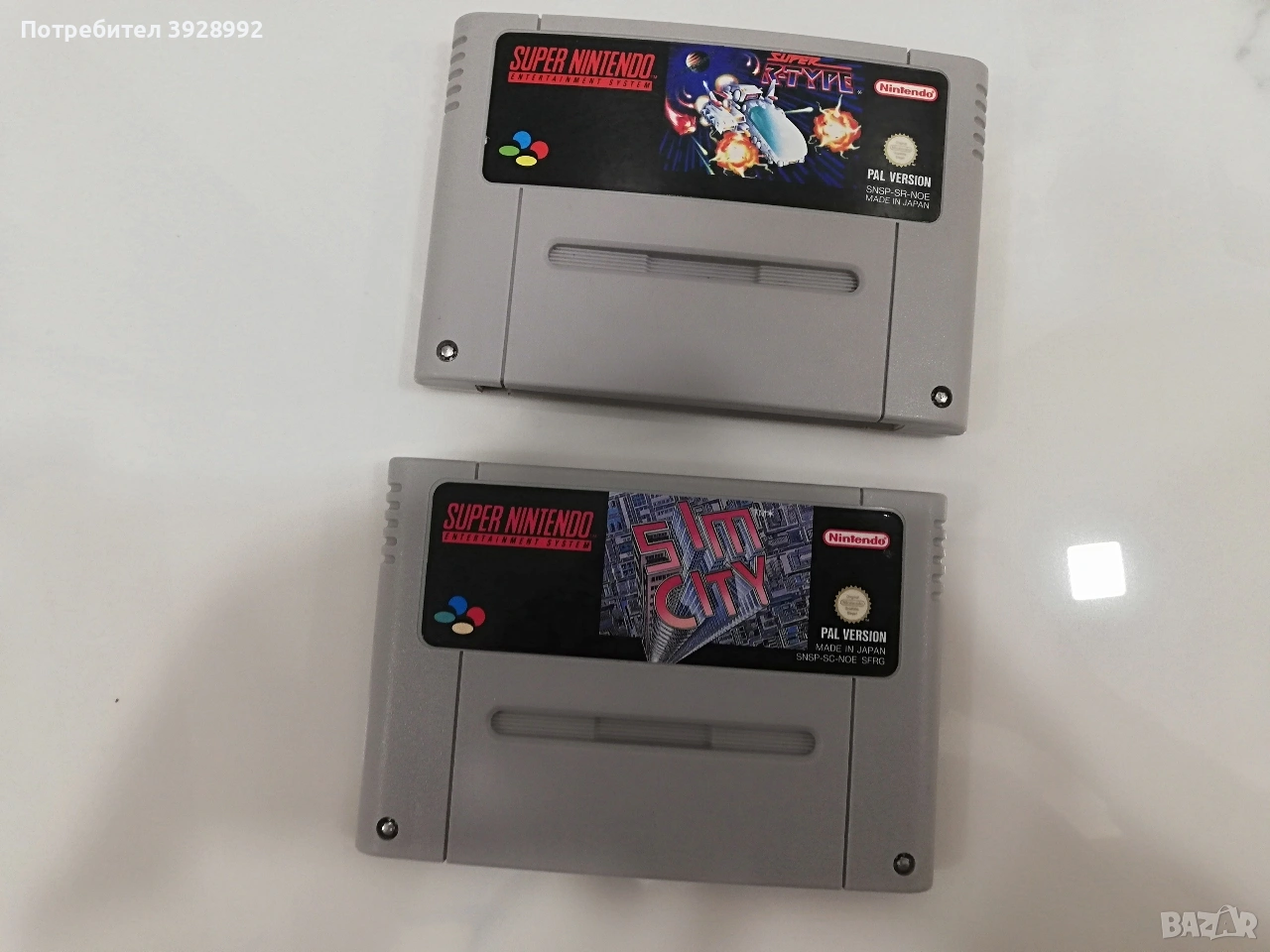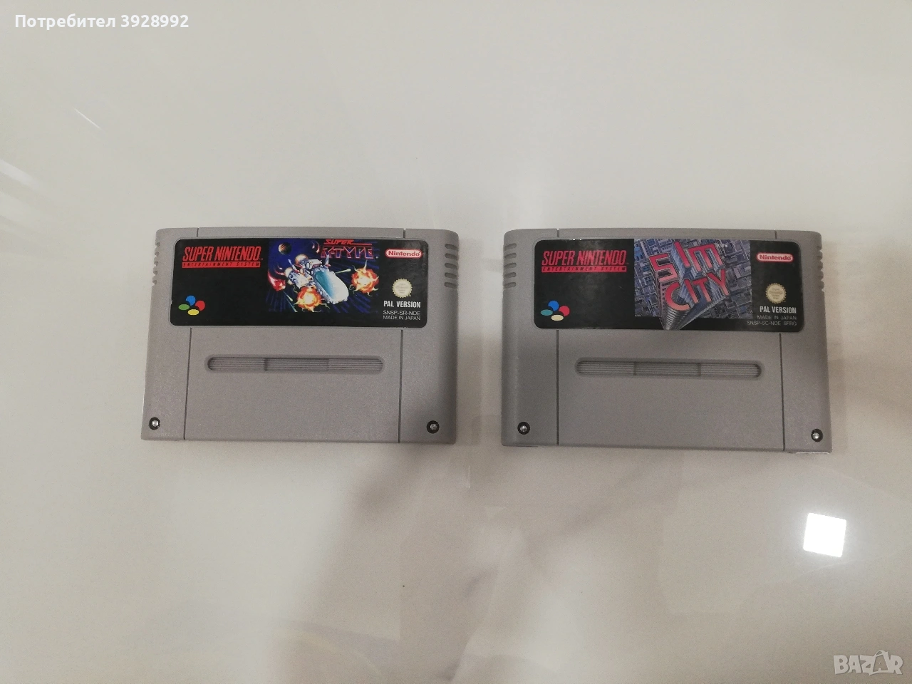 2 бр игри за Super Nintendo (SNES) R-Type (SNES / PAL версия) Side-scrolling shoot ’em up Една от най-трудните и уважавани аркадни поредици. Жанр: Космически шутър Геймплей: Управляваш космически кораб и пробиваш път през вълни от извънземни врагове Фишка: Оръжието Force Pod – може да се закача отпред или отзад на кораба и напълно променя стратегията Трудност: Безпощадна – изисква памет, прецизност и нерви от стомана Атмосфера: Мрачна sci-fi естетика, биомеханични босове (много „Giger“ вайб) Това е игра за хардкор фенове и колекционери – не прощава грешки. SimCity (SNES / PAL версия) Легендарният градостроителен симулатор, адаптиран за конзола. Жанр: Симулатор / стратегия Геймплей: Строиш град – зони за живеене, индустрия, инфраструктура, данъци Предизвикателства: Бюджет, престъпност, замърсяване, природни бедствия SNES особености: По-цветна и „жива“ визия Конзолно управление Специален Nintendo-ексклузивен режим с чудовища и UFO Темпо: Спокойно, но изисква мислене и планиране Класика, която доказва, че стратегиите работят и без мишка. Цената е за бр.
